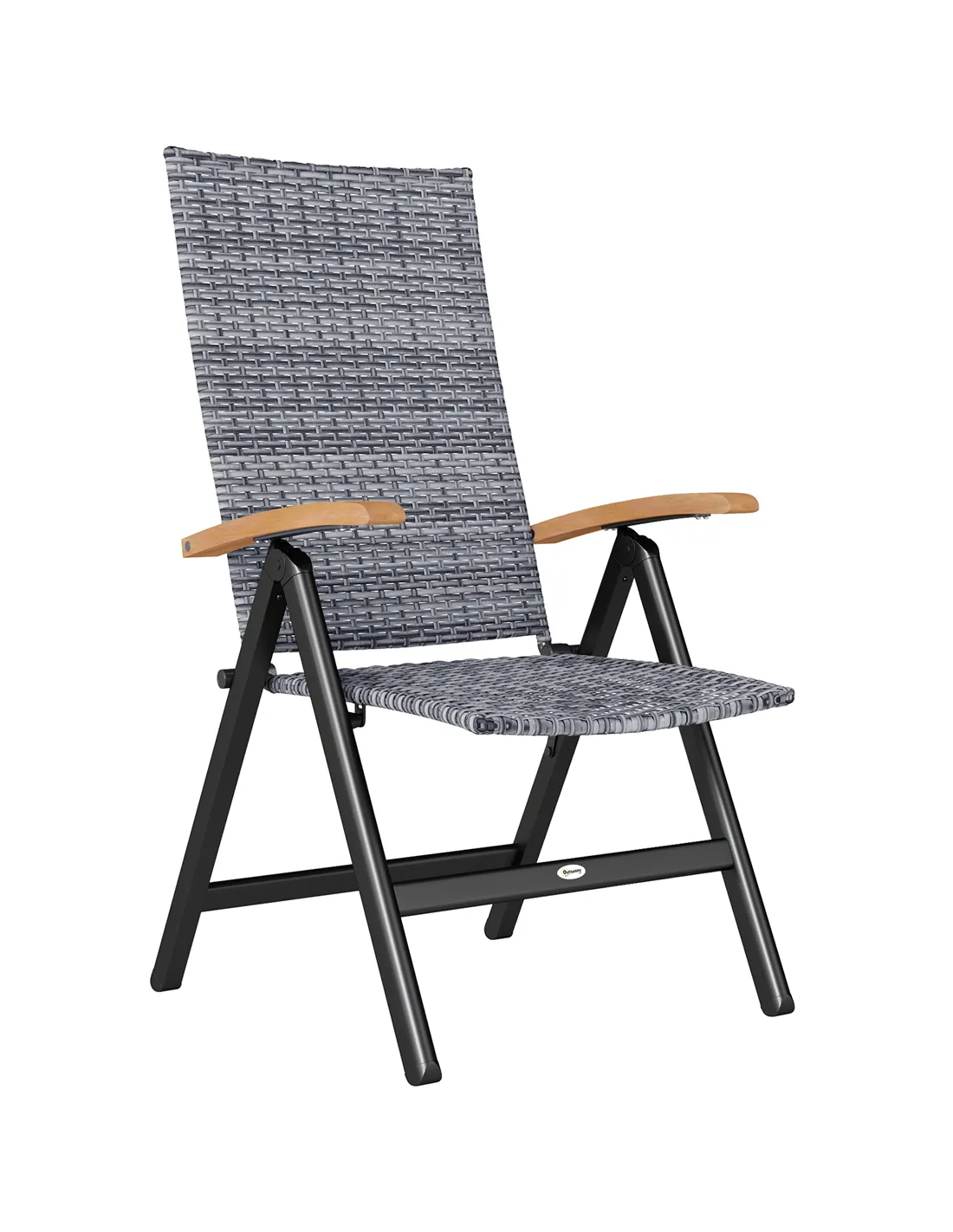 Perfectly suited for British gardens, patios, and outdoor dining areas, this Outsunny folding rattan chair offers versatile comfort and style. Whether enjoying a sunny afternoon tea, hosting a barbecue, or relaxing with a book, its five-level reclining backrest allows you to find the ideal seating position. The light grey plastic rattan complements a variety of outdoor décors, while the natural wooden armrests add a touch of elegance. Its foldable design makes it ideal for seasonal storage or taking along to picnics and camping trips. Thanks to its robust steel frame and weather-resistant materials, it remains a reliable choice for year-round outdoor use.