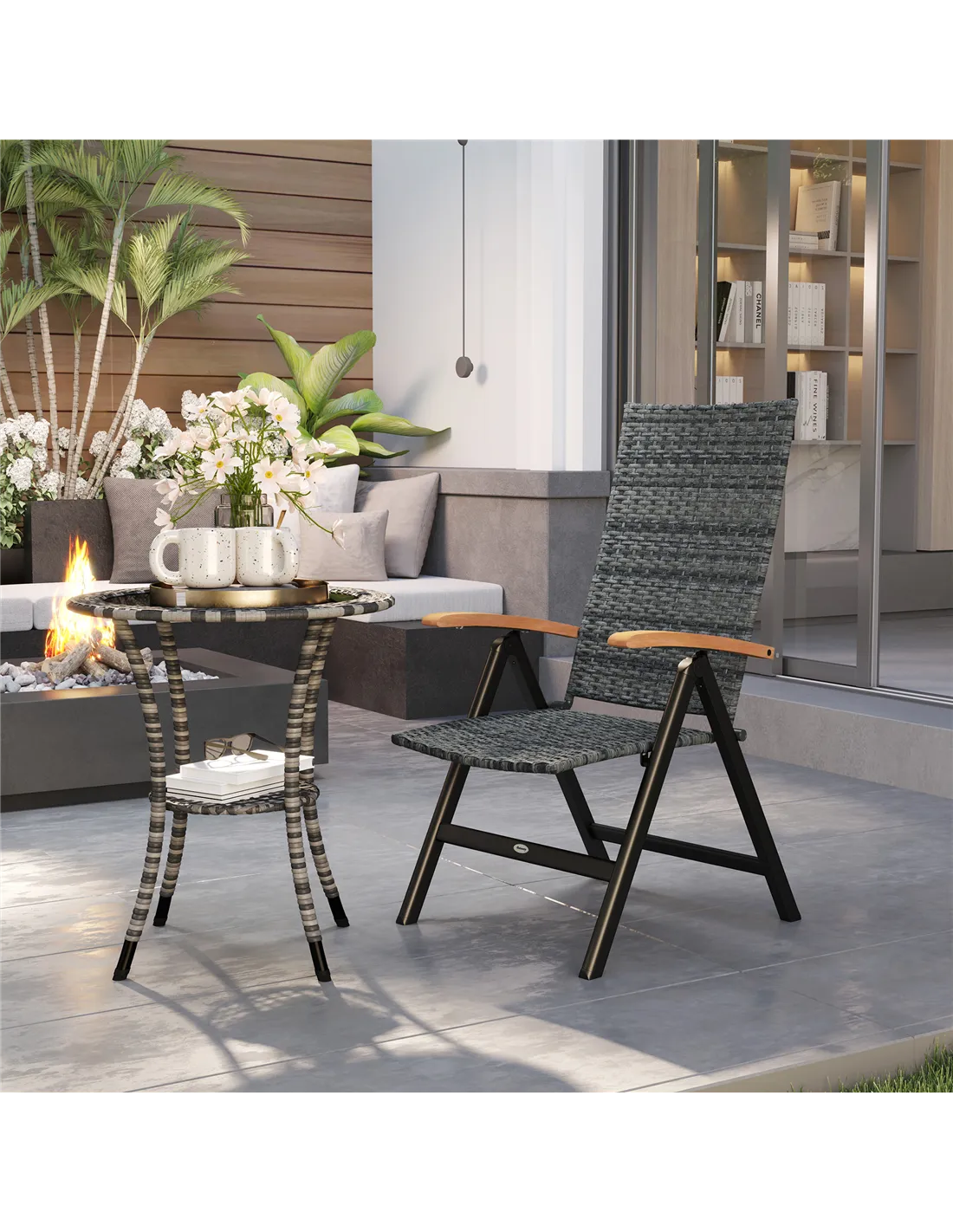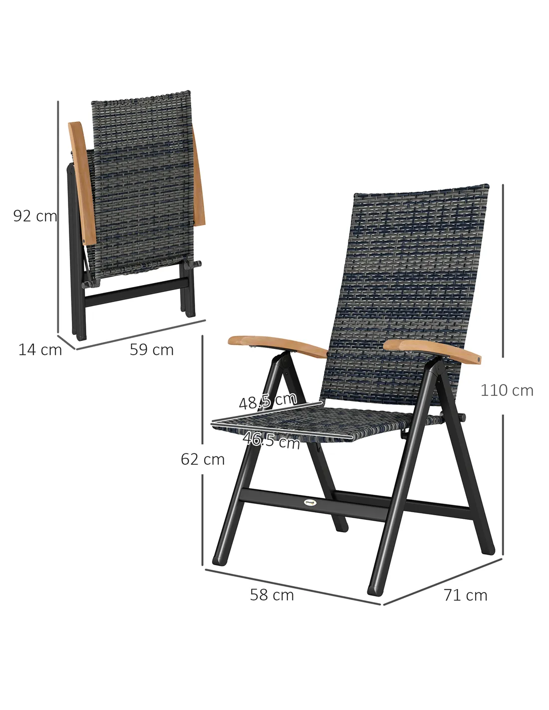 The Outsunny folding rattan garden chair is perfect for enhancing your outdoor living space. Ideal for relaxing on the patio, balcony, or garden, its five-level reclining backrest allows you to find the perfect position for reading, sunbathing, or enjoying a meal alfresco. The mixed-grey rattan finish complements a variety of outdoor décors, while the wooden armrests add a natural touch and extra comfort. Thanks to its foldable design, it’s easy to store during the off-season or transport for picnics and camping trips. This chair also suits conservatories and sunrooms, providing a stylish yet practical seating option for year-round use.