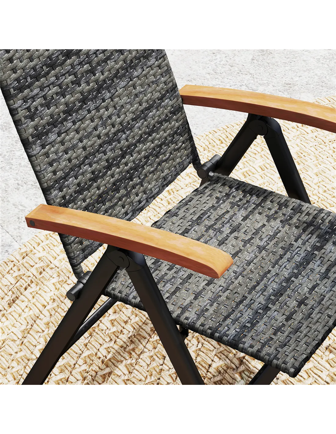 Outsunny Folding Rattan Garden Dining Chair with 5-level Reclining High Back, Wood Armrests for Outdoor, Patio - Mixed-grey