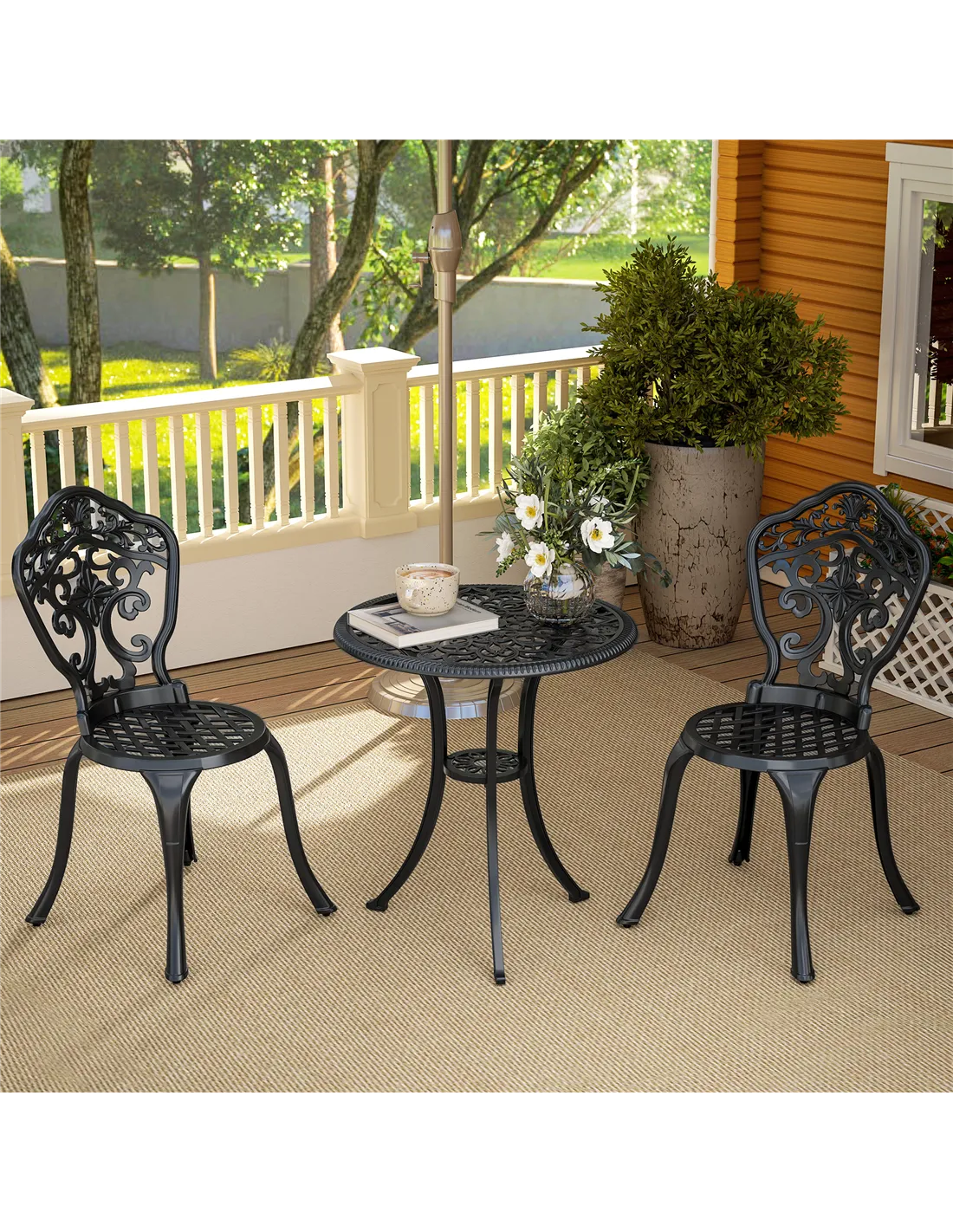 The Outsunny three-piece aluminium bistro set is perfect for creating a cosy outdoor retreat in your garden, patio, or balcony. Its elegant floral cut-out design and sleek black finish complement a variety of outdoor décors, making it ideal for morning coffees, afternoon teas, or intimate dinners. Thanks to the parasol hole in the table, you can easily add shade on sunny days, enhancing comfort during warm weather. This set also suits small outdoor cafés or bistro-style dining areas, providing a stylish yet durable seating solution. Adjustable feet pads ensure stability on uneven surfaces, making it versatile for different outdoor environments.
