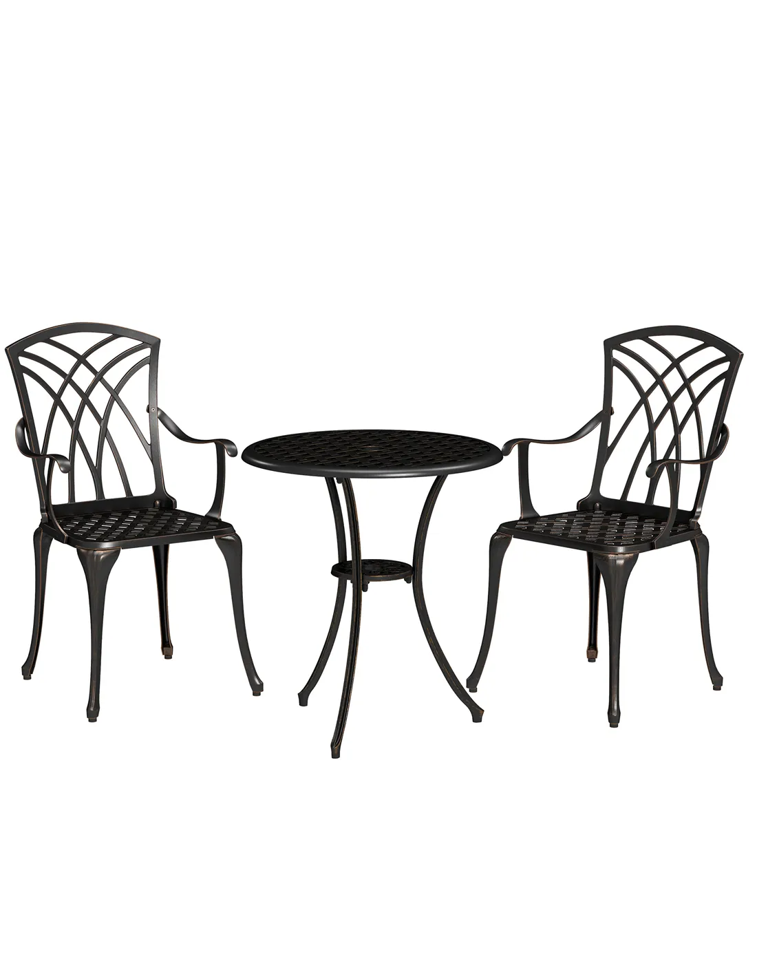 This three-piece outdoor garden furniture set from Outsunny will give you the optimal spot to dine and relax. It's formed of two chairs and a matching table, with cast aluminium forming the frame of all pieces to ensure they are robust and tough. Round in shape, the table features a middle hole to keep a sun parasol securely in place, with the back of the chairs showcasing a cut-out design for an attractive finish. Our outdoor table and chairs are great for flats and apartments with balconies.
