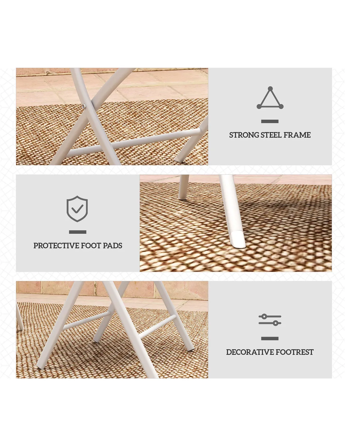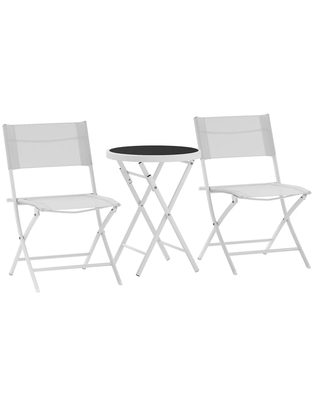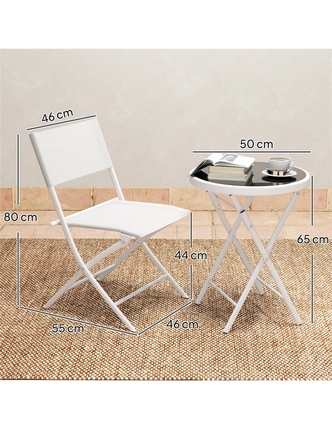 Discover the charm of the Outsunny Outdoor Bistro Set, a delightful addition to any garden or patio. This three-piece patio set, including two chairs and a table, folds away for effortless storage. Crafted with a steel frame and breathable mesh fabric, it ensures comfort and style with its sleek tempered glass tabletop. Suitable for any garden, balcony setting.
