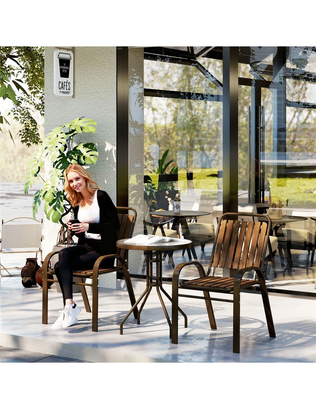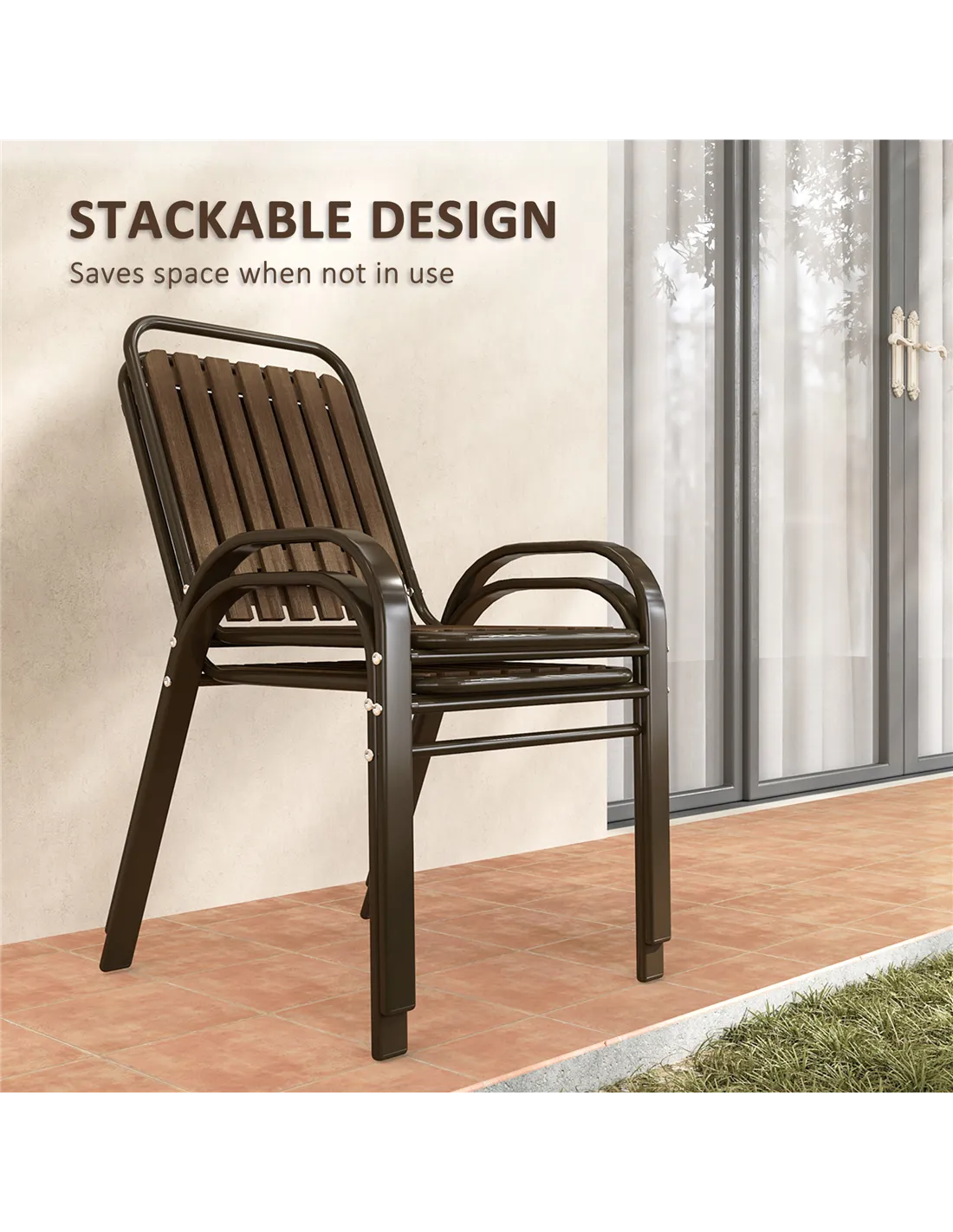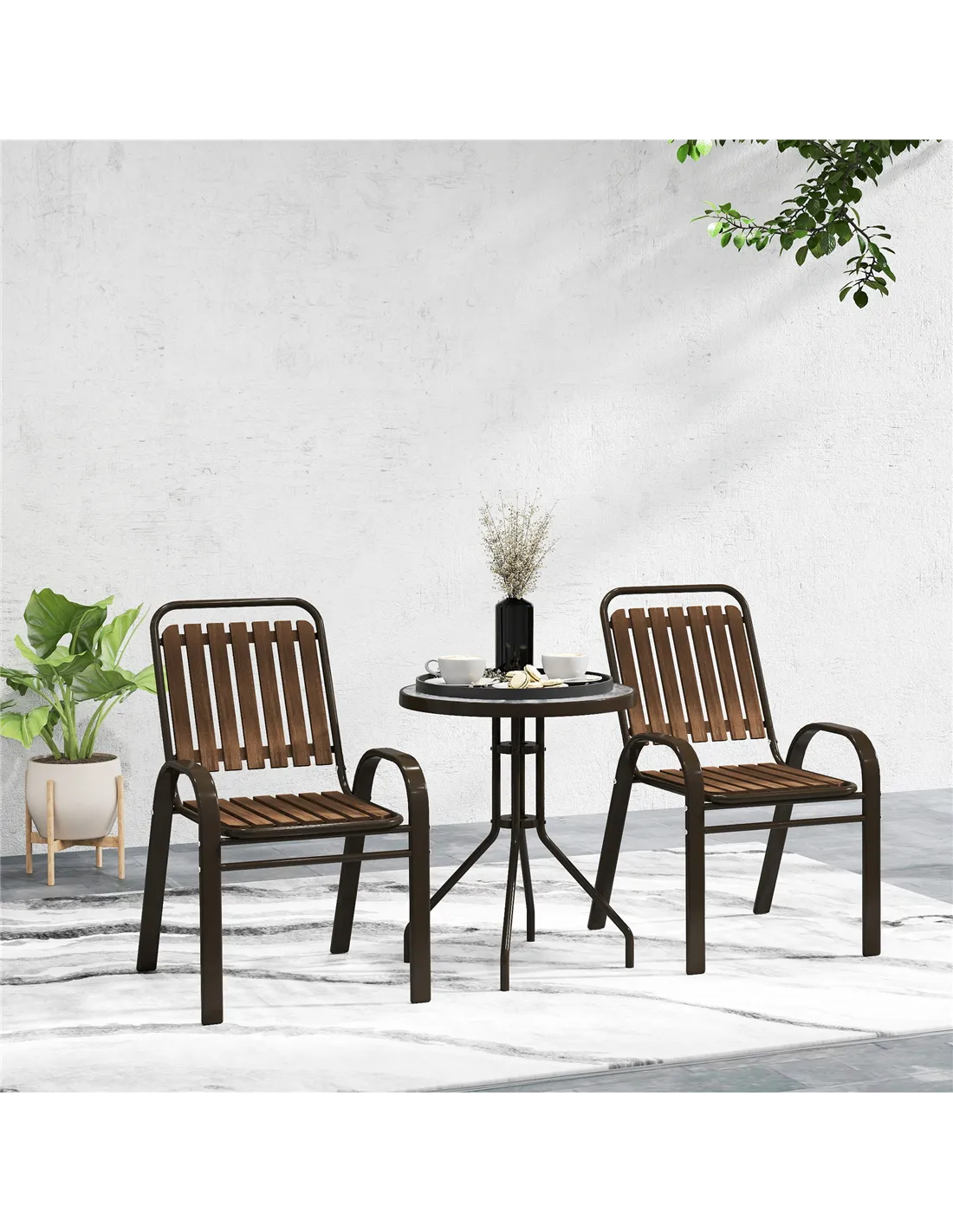 Discover the charm of the Outsunny Outdoor Bistro Set! This chic patio set features two armchairs with a stylish wood grain veneer and a sophisticated water-ripple tempered glass coffee table. Its stackable design makes it a space-saver for any garden, patio, or balcony, ensuring elegance and functionality in your outdoor space. Enjoy the blend of beauty and practicality, suitable for any conservatory or garden setting.