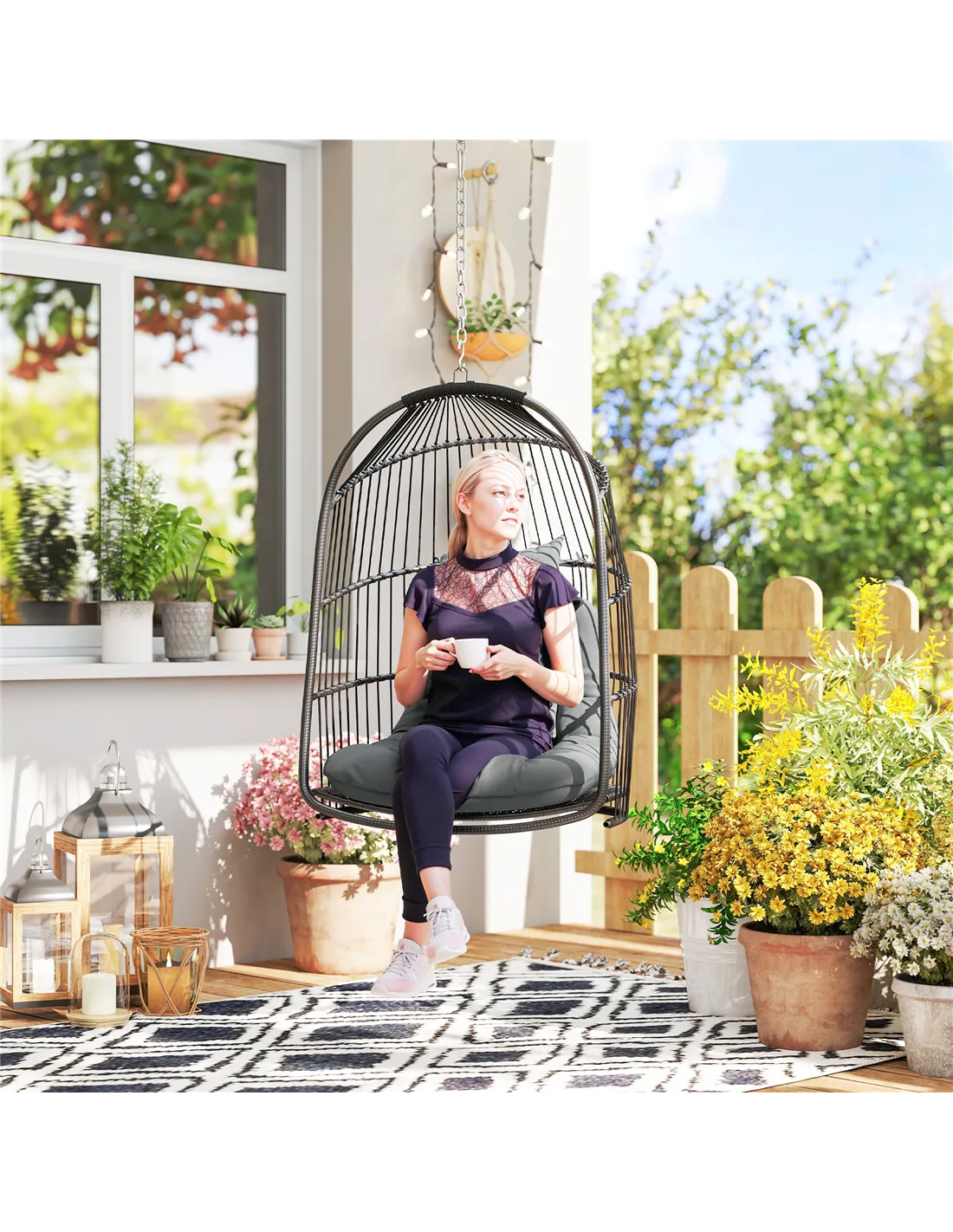 The Outsunny hanging egg chair is a versatile addition to any home or garden setting. Ideal for relaxing on a sunny afternoon, it fits perfectly on patios, porches, or even indoors in a cosy reading nook. Thanks to its foldable design and lightweight rattan construction, it can be easily stored away during the colder months or repositioned to refresh your outdoor space. The thickened cushion and headrest provide exceptional comfort, making it a favourite spot for unwinding with a book or enjoying a cup of tea. Its 360-degree swivel hook allows gentle rotation, enhancing the relaxing experience whether placed in a garden corner or a bright conservatory.