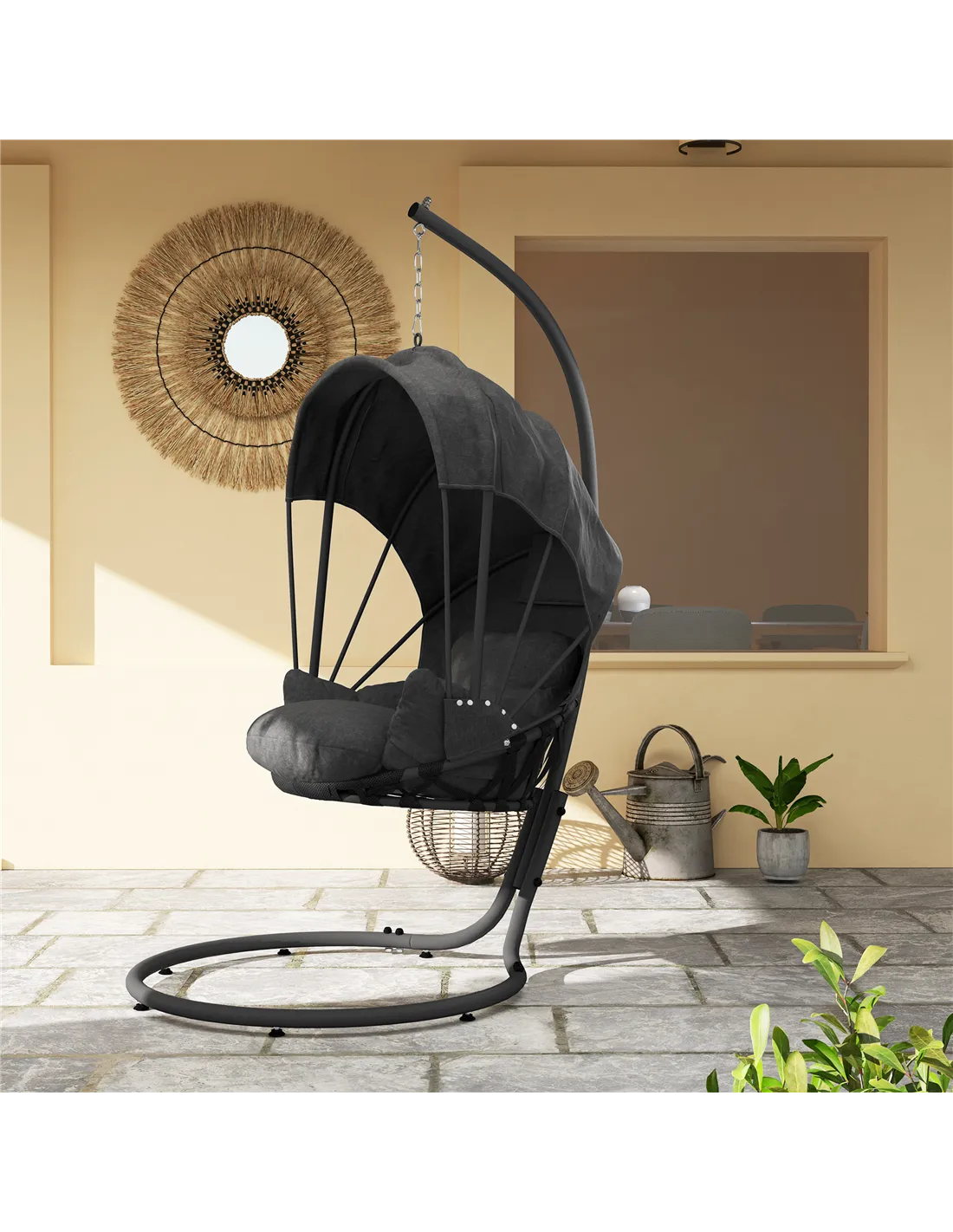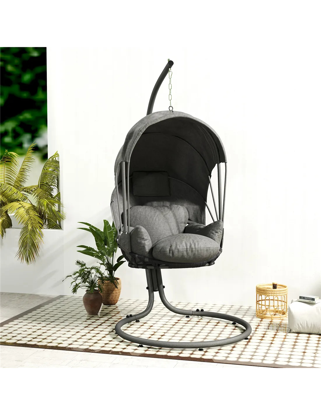 Make the most of your lazy days with this modern egg chair with stand from Outsunny. The retractable canopy, curved back, spacious seat and soft cushion offer a comfortable sitting experience. The hanging stand of the swinging egg chair is crafted from steel so it's strong, with a large base for balance. Easy to store with a foldable seating basket, space-saving and convenient. Relax and unwind, whenever you want.