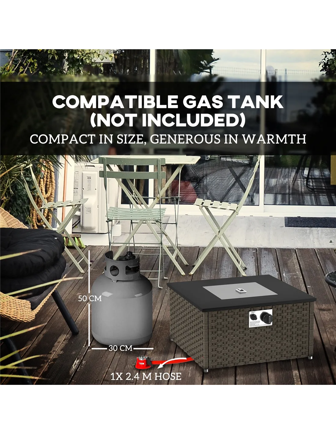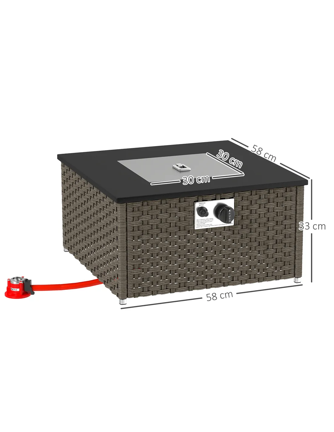 Outsunny Rattan Gas Fire Pit Table for Garden, 13 KW Smokeless Propane Fire Pit with Lid, Square Garden Coffee Table with Patio Heater for Outdoor, Patio, 58 x 58 x 33 cm, Grey