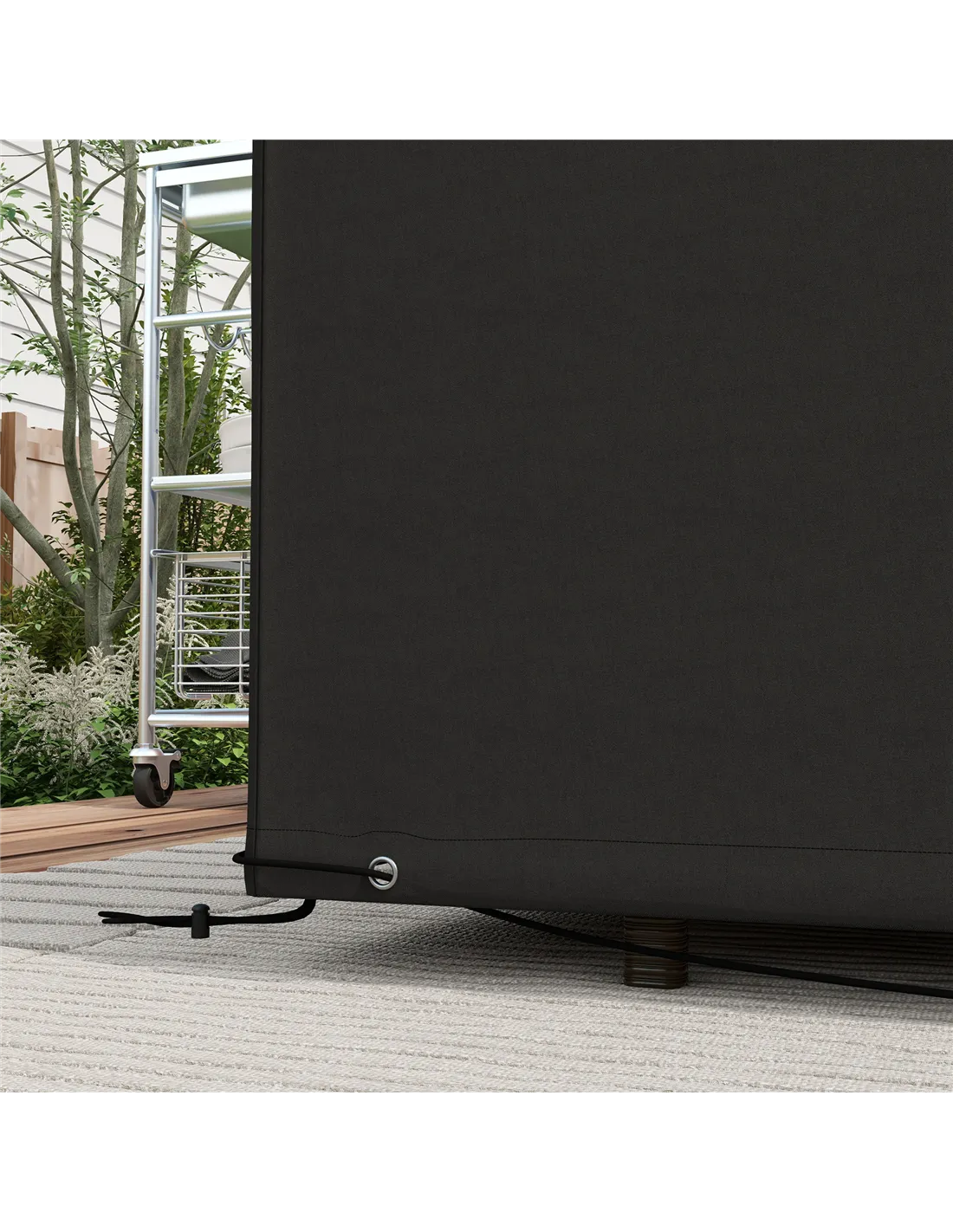 - Drawstring pull cord with weatherproof eyelets and cord lock to hold cover in place