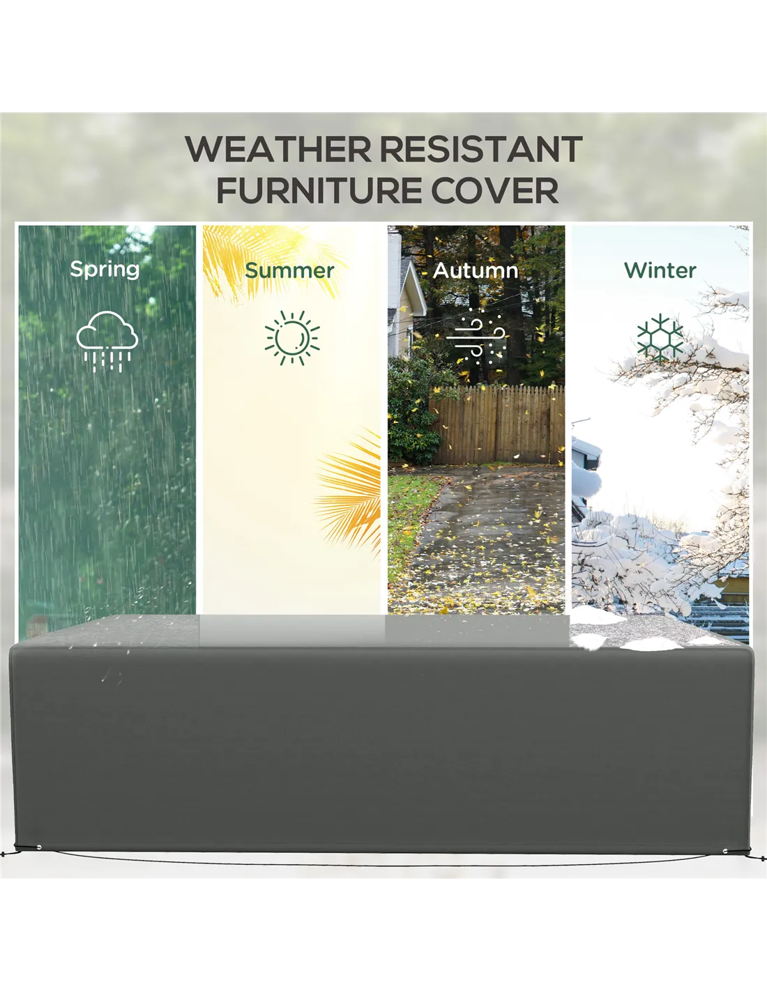 The Outsunny garden furniture cover is ideal for protecting your outdoor seating and table sets from the unpredictable British weather. Perfectly suited for rectangular sofa and table arrangements, it shields your patio furniture from rain, frost, dust, and harmful UV rays, ensuring longevity and maintaining appearance. Use it to cover garden benches, dining sets, or even indoor furniture during renovation or storage periods. Its dark grey hue blends seamlessly with most garden décors, while the heavy-duty Oxford fabric offers robust protection without compromising style. When not in use, the cover folds compactly for easy storage, making it a practical addition to any home.