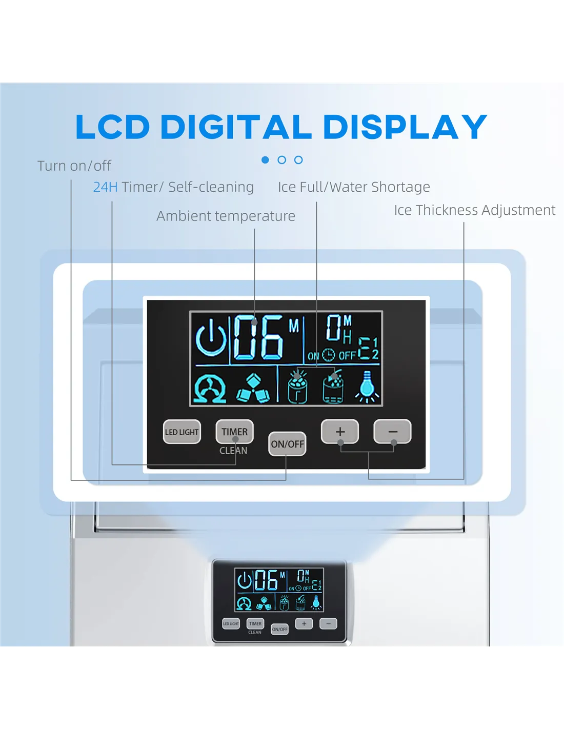 - Easy-to-read indicators show water shortage, water intake, ice making, ice full and ambient temperature