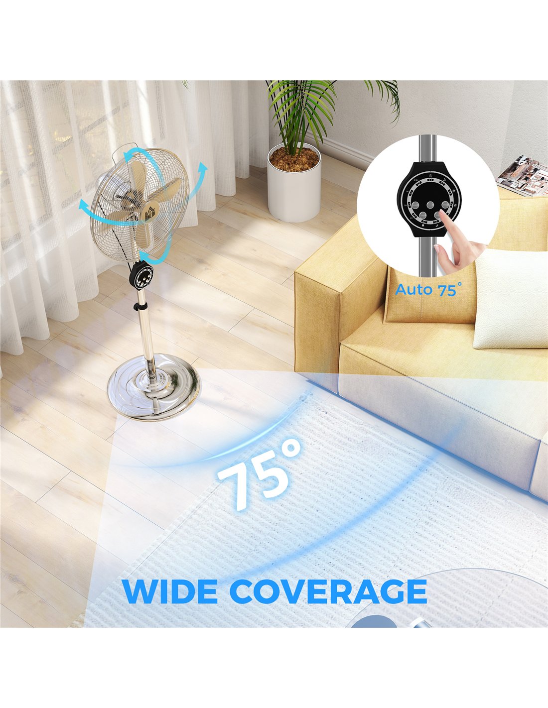 The HOMCOM 16" metal pedestal fan is ideal for enhancing air circulation in various living spaces across your home. Its adjustable height and 75° oscillation make it perfect for cooling bedrooms, living rooms, home offices, or kitchens, ensuring a refreshing breeze reaches every corner. Thanks to its sleek silver tone and sturdy metal construction, it complements modern interiors while providing reliable performance during warm British summers. Use the remote control to adjust settings effortlessly from your favourite chair or bedside, making it a practical addition to any room where comfort is a priority.