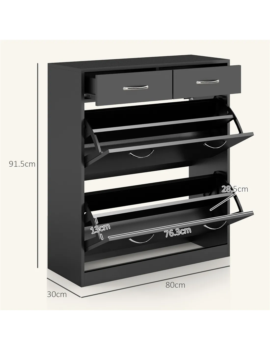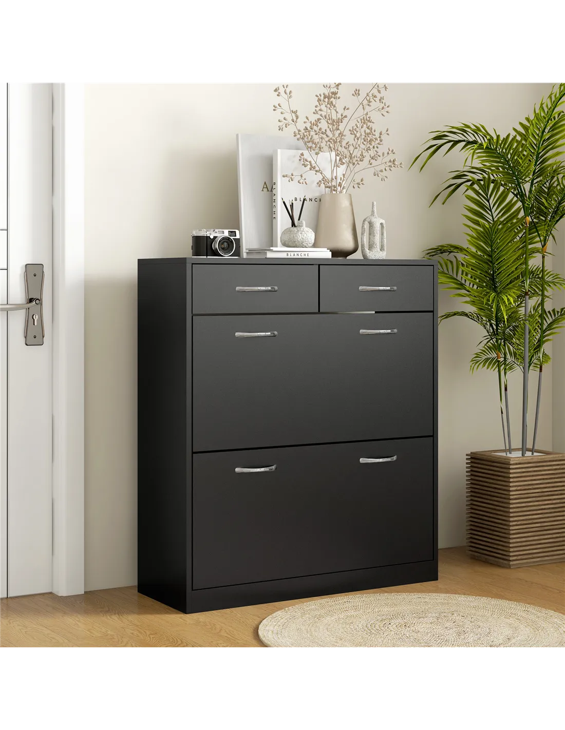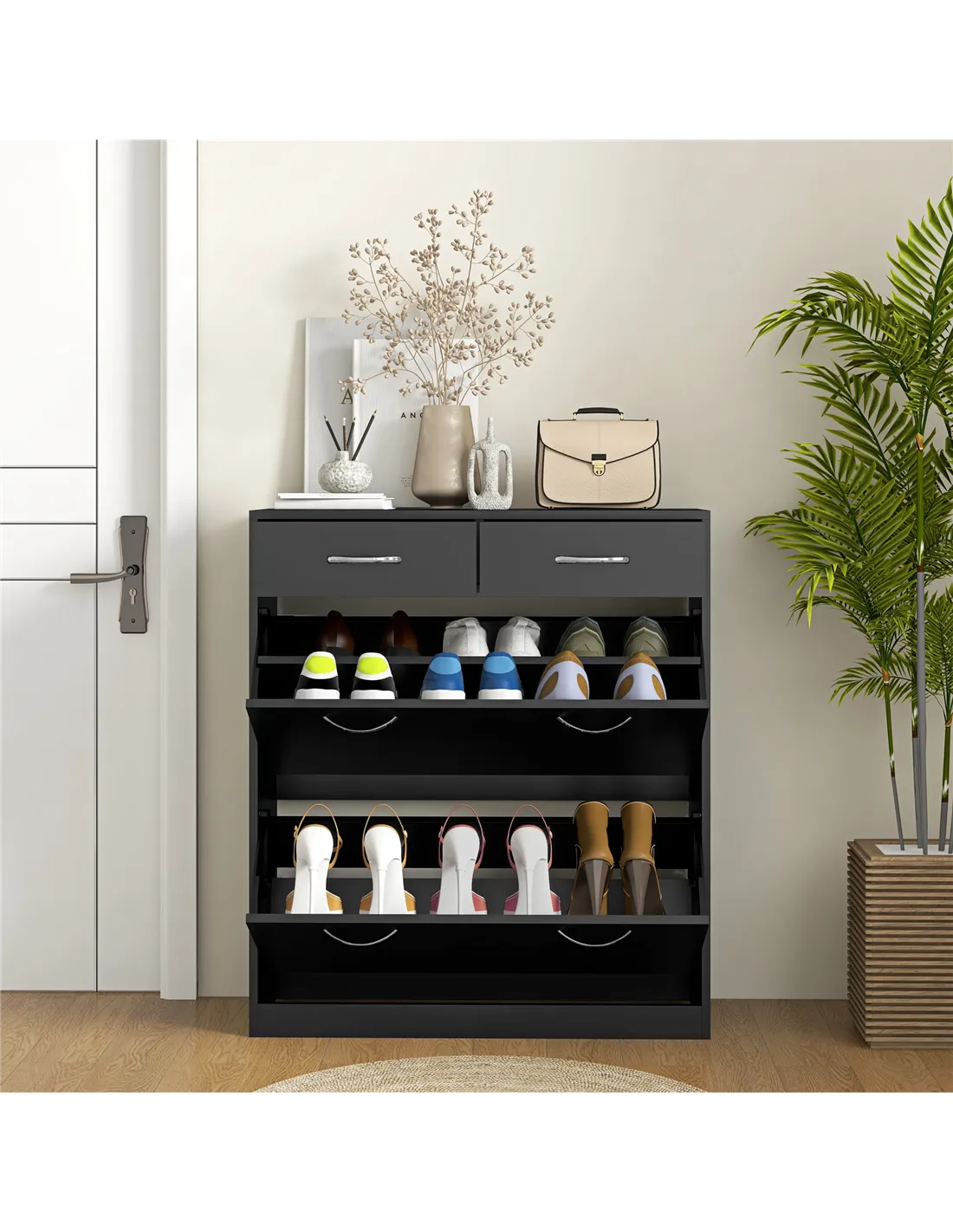 - Use the two flip drawers to store smaller accessories such as shoe care products, socks, or keys, enhancing organisation.