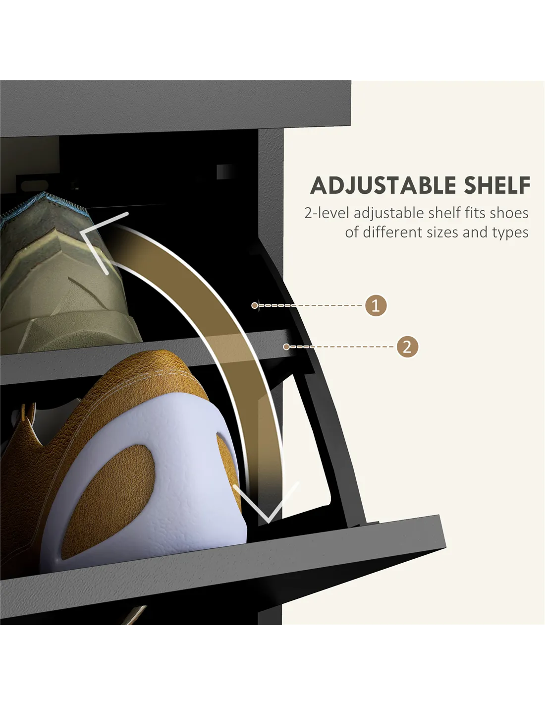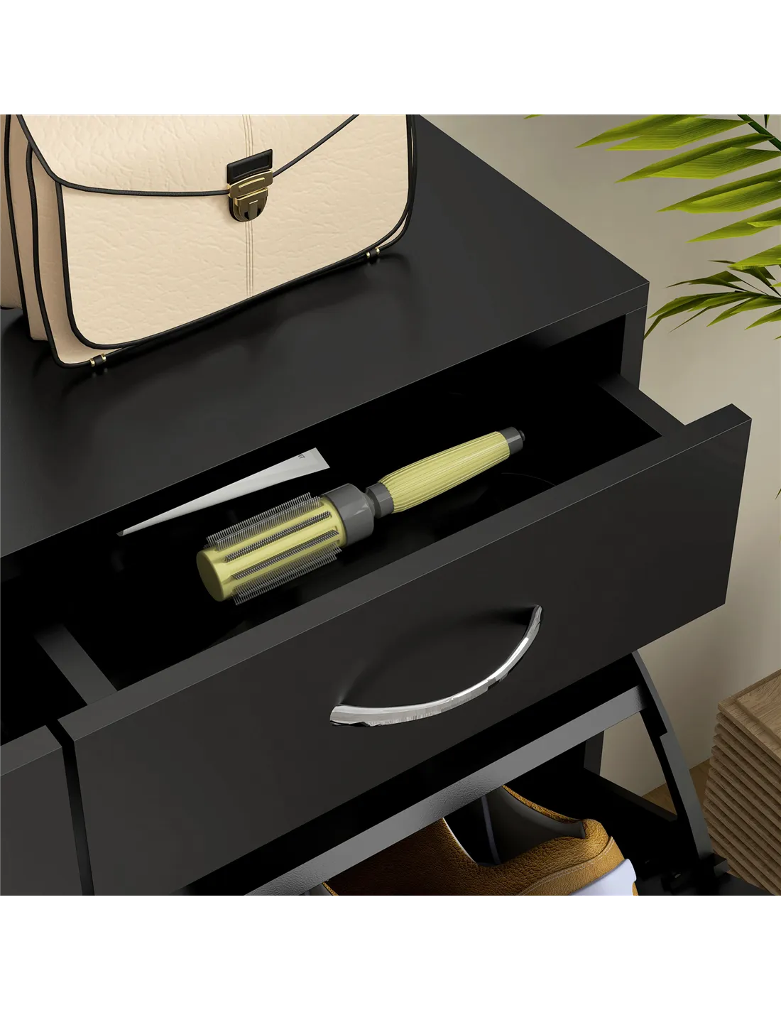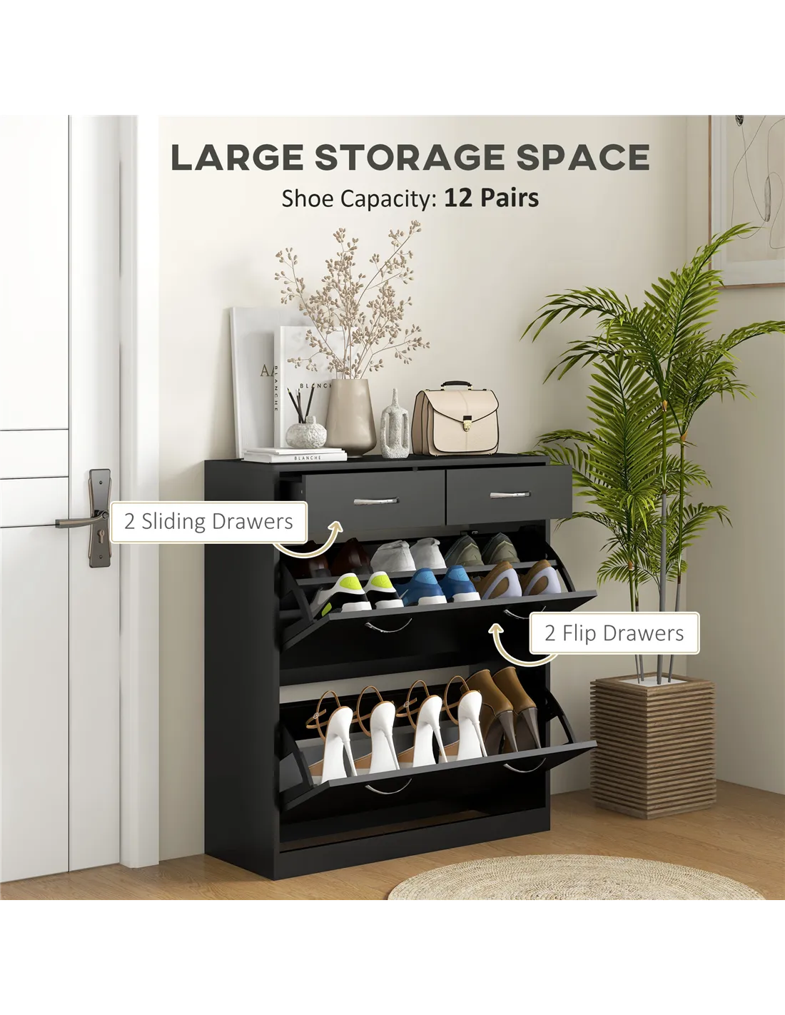 - Use the two flip drawers to store smaller accessories such as shoe care products, socks, or keys, enhancing organisation.