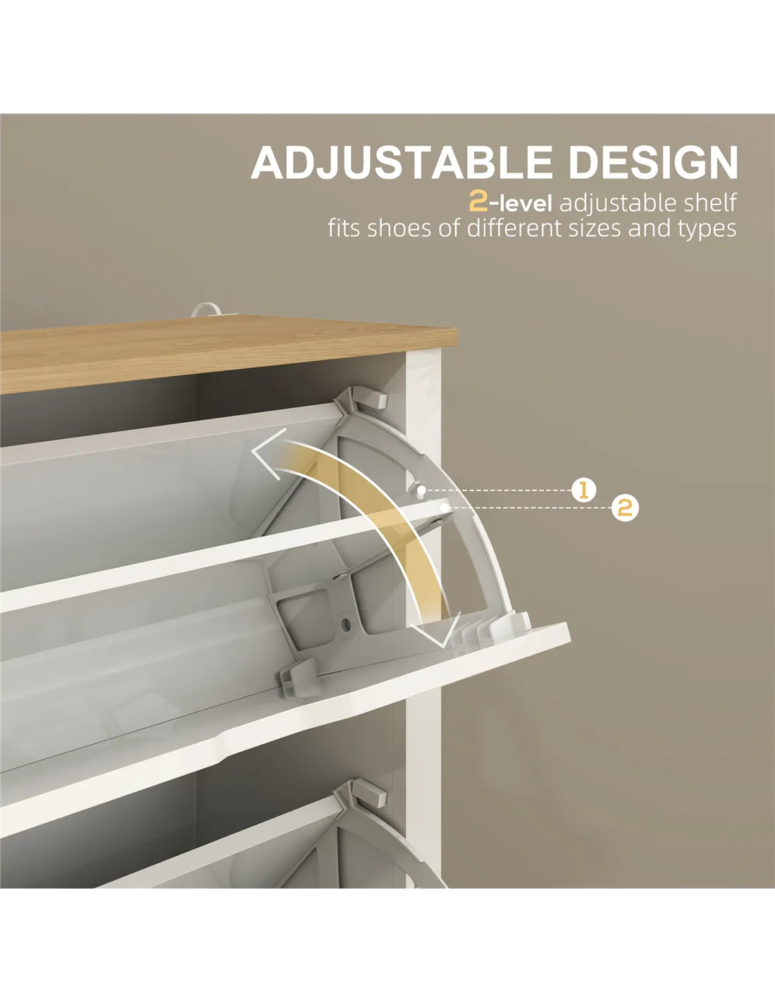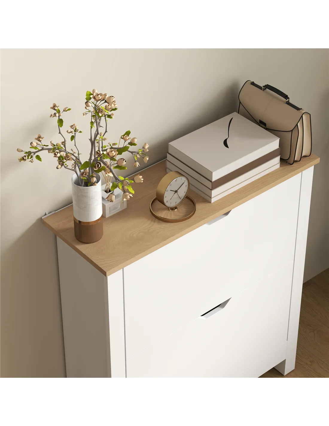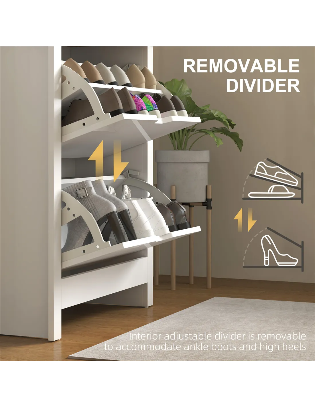 The HOMCOM slim shoe cabinet is an ideal storage solution for narrow hallways, compact bedrooms, or cosy flats where space is limited. Its sleek high gloss white finish complements modern interiors, making it perfect for keeping footwear organised without overwhelming your décor. Use the flat top surface to display decorative items, keys, or mail, transforming an entryway into a tidy, welcoming space. Adjustable shelves inside the flip drawers accommodate various shoe styles, from trainers to formal shoes, fitting up to 12 pairs (maximum UK size 8). Thanks to its slim profile and sturdy build, this cupboard fits effortlessly beside wardrobes or under staircases, helping to maintain a clutter-free home.