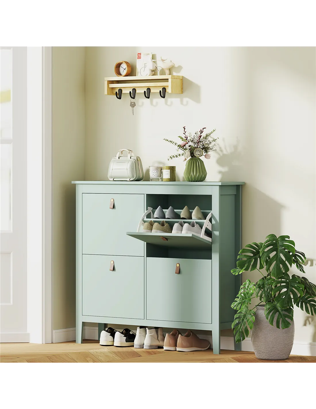 The HOMCOM four-drawer shoe cabinet in green is an ideal storage solution for compact living spaces, such as flats, hallways, or bedrooms. Its slim profile fits neatly into narrow corridors, helping to keep footwear organised and easily accessible. Thanks to adjustable dividers, it accommodates a variety of shoe styles, from trainers and boots to formal shoes, making it perfect for families or individuals with diverse collections. The flat top surface can be used to display decorative items, keys, or daily essentials, enhancing both functionality and style in your home. For added safety, the included anti-tipping kit ensures secure wall fixing, making it suitable for households with children or pets.