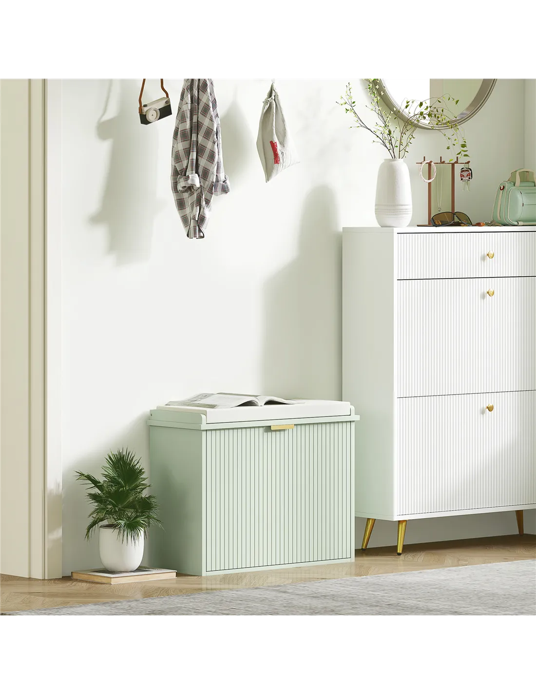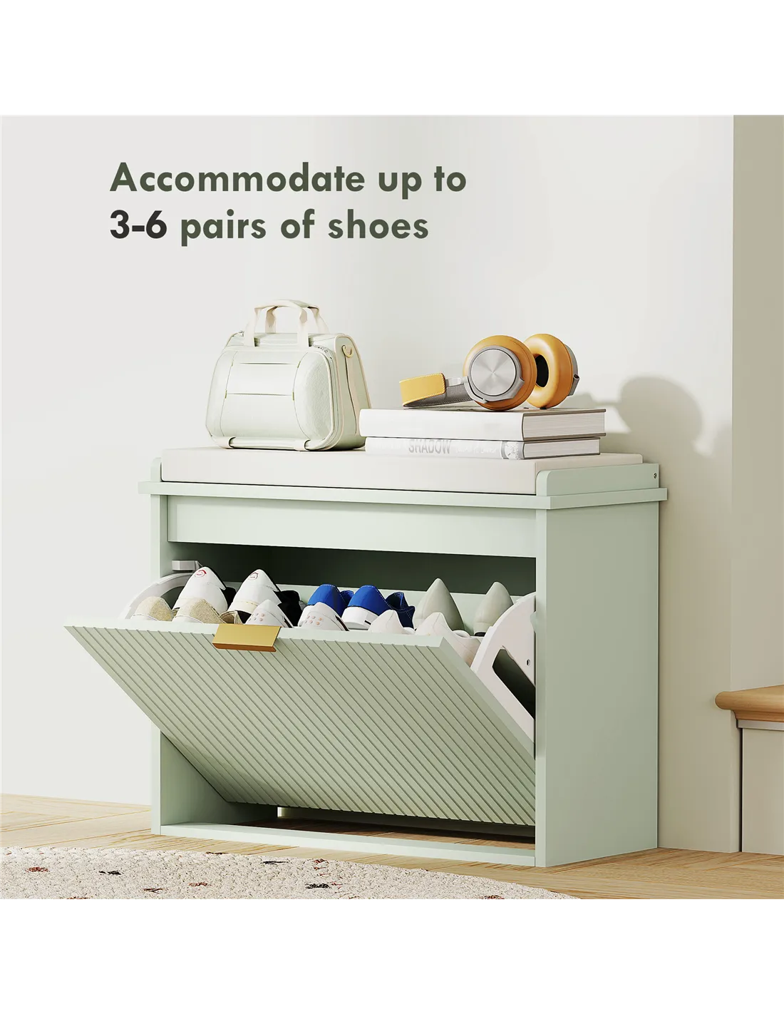 - Compact shoe storage bench saves entryway space
