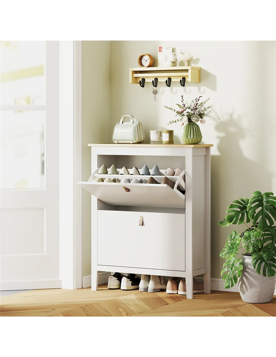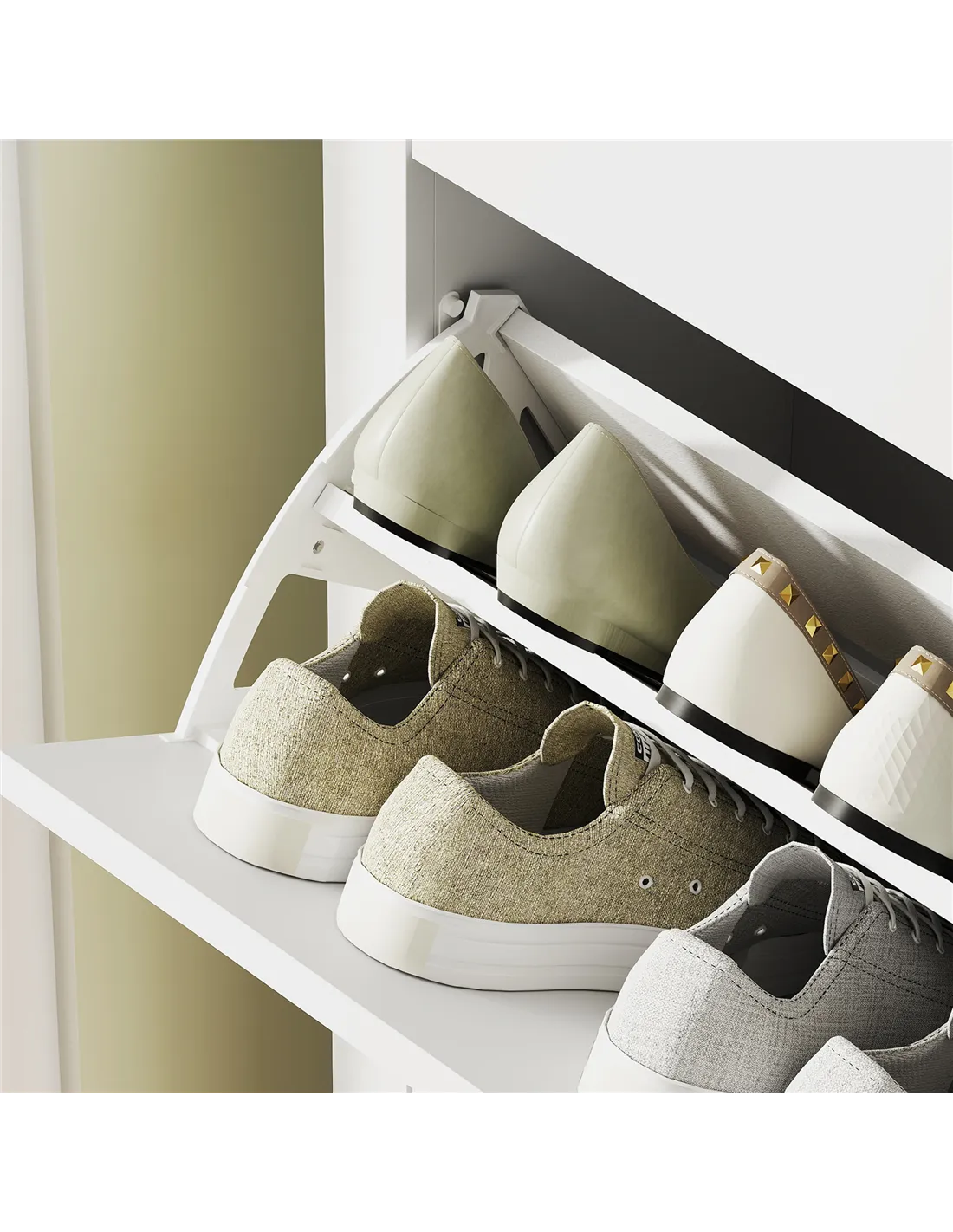 - Two flip drawers store up to 14 shoe pairs