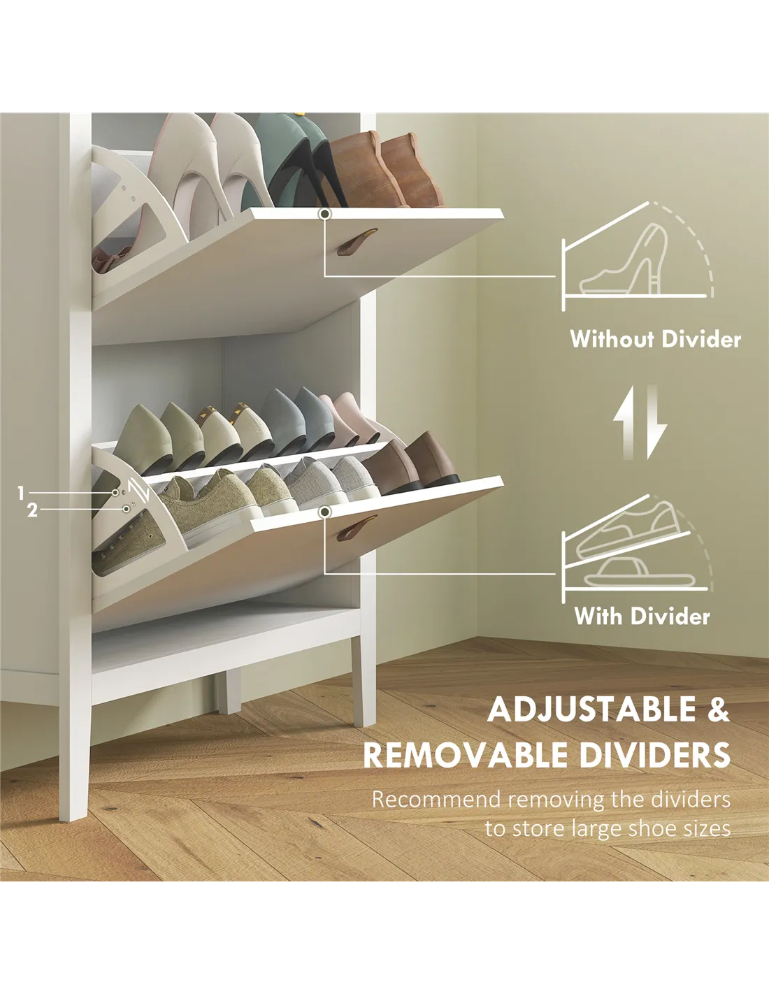 - Two-level adjustable dividers fit various shoe types, or can be removed for larger shoe sizes (up to UK men 10.5)