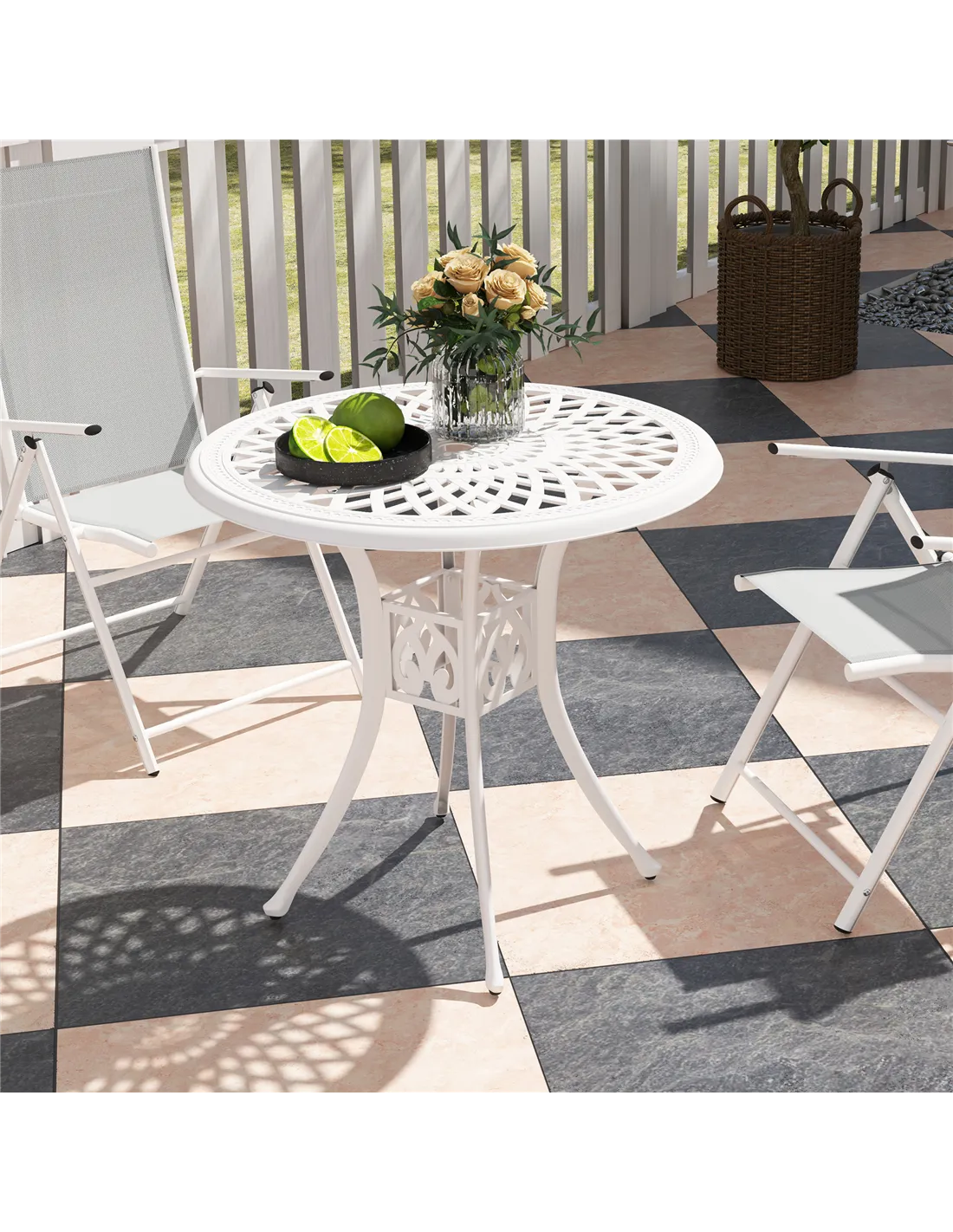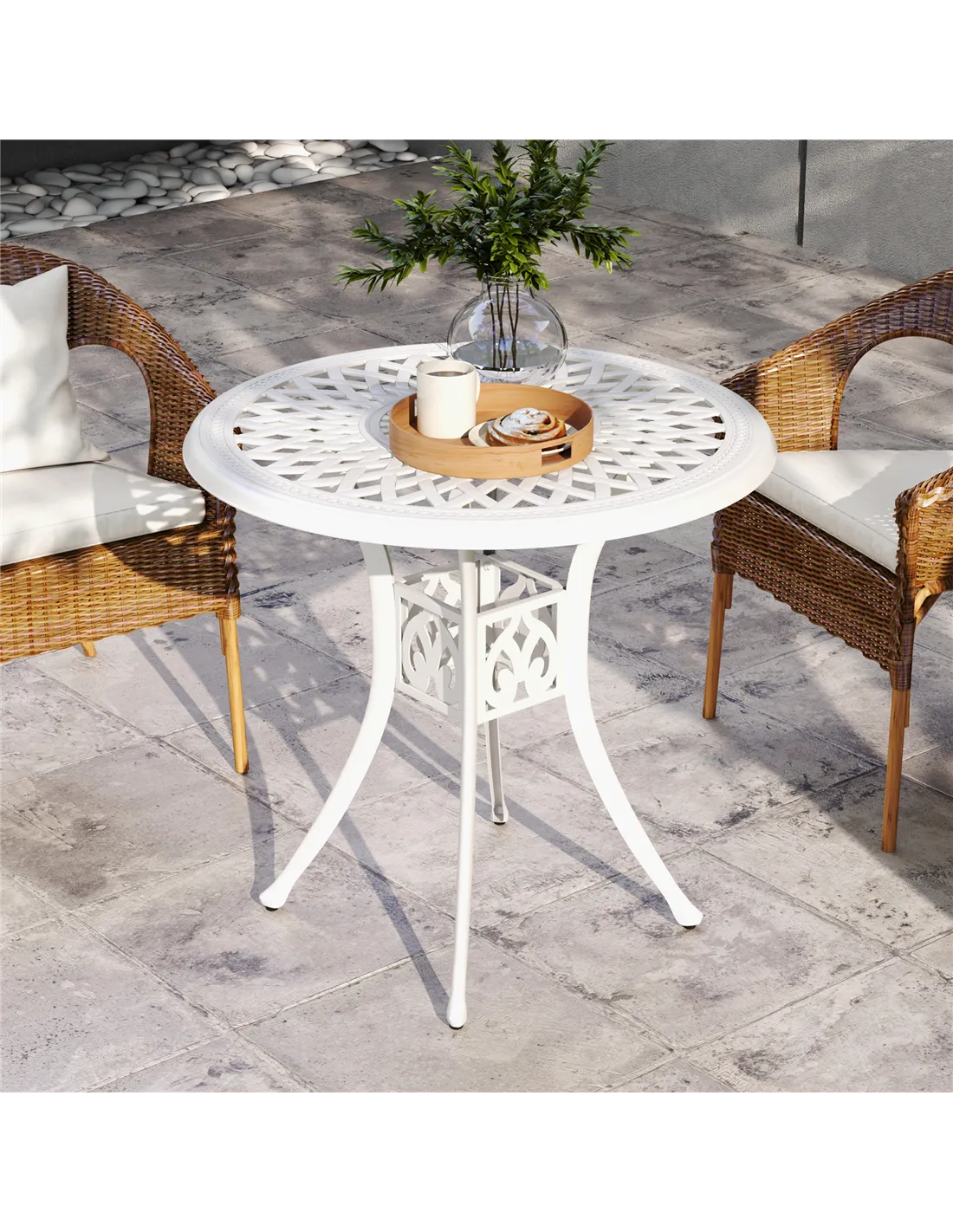 The Outsunny 78 cm round garden dining table is an ideal addition to any outdoor setting, whether it’s a cosy patio, a sunlit balcony, or a charming garden corner. Thanks to its durable cast aluminium frame with a powder-coated finish, it withstands the unpredictable British weather while maintaining its elegant appearance. The central parasol hole allows you to easily add shade on sunny days, making it perfect for alfresco dining, afternoon tea, or casual gatherings. Pair it with matching bistro chairs to create a welcoming space for friends and family to enjoy meals or simply relax outdoors. Its compact size suits smaller outdoor areas without compromising on style or functionality.