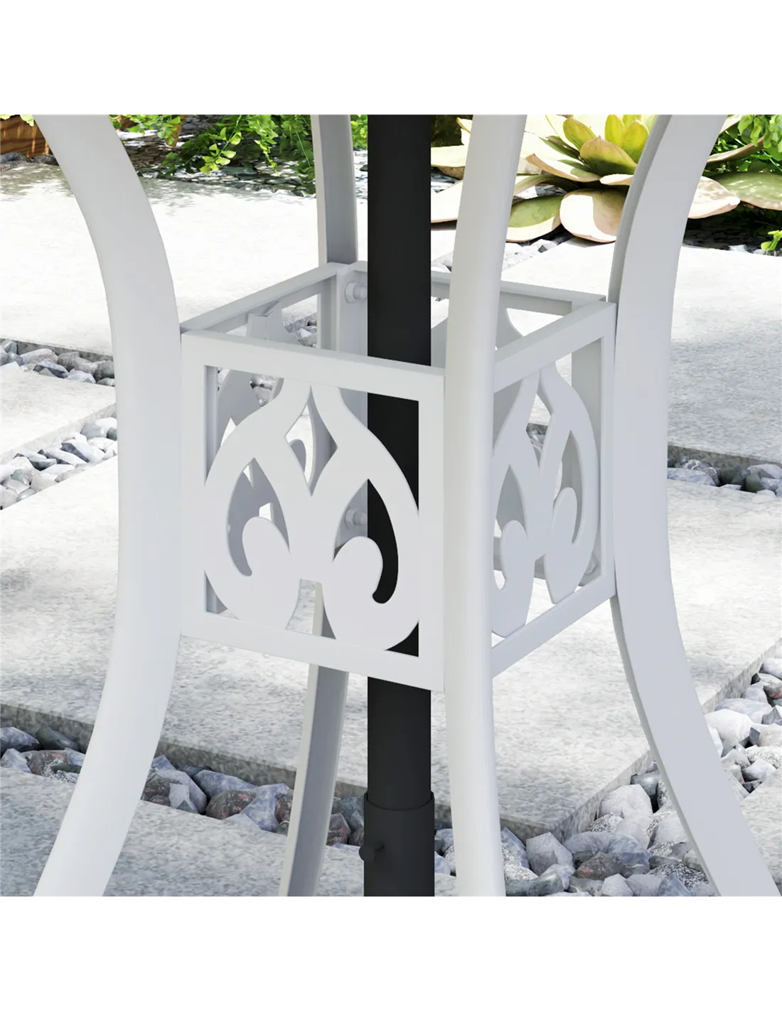 A handy holding spot, which also brings style into your garden and outdoor areas: this round bistro table from Outsunny. Cast aluminium is tough, with a powder coating for extra strength and protection. It's crafted into cut-out design for something a little bit different-great for those who like to make an impression. A middle hold is for holding a parasol umbrella to keep you shaded. To complete, pair with bistro chairs, so everyone can gather round.