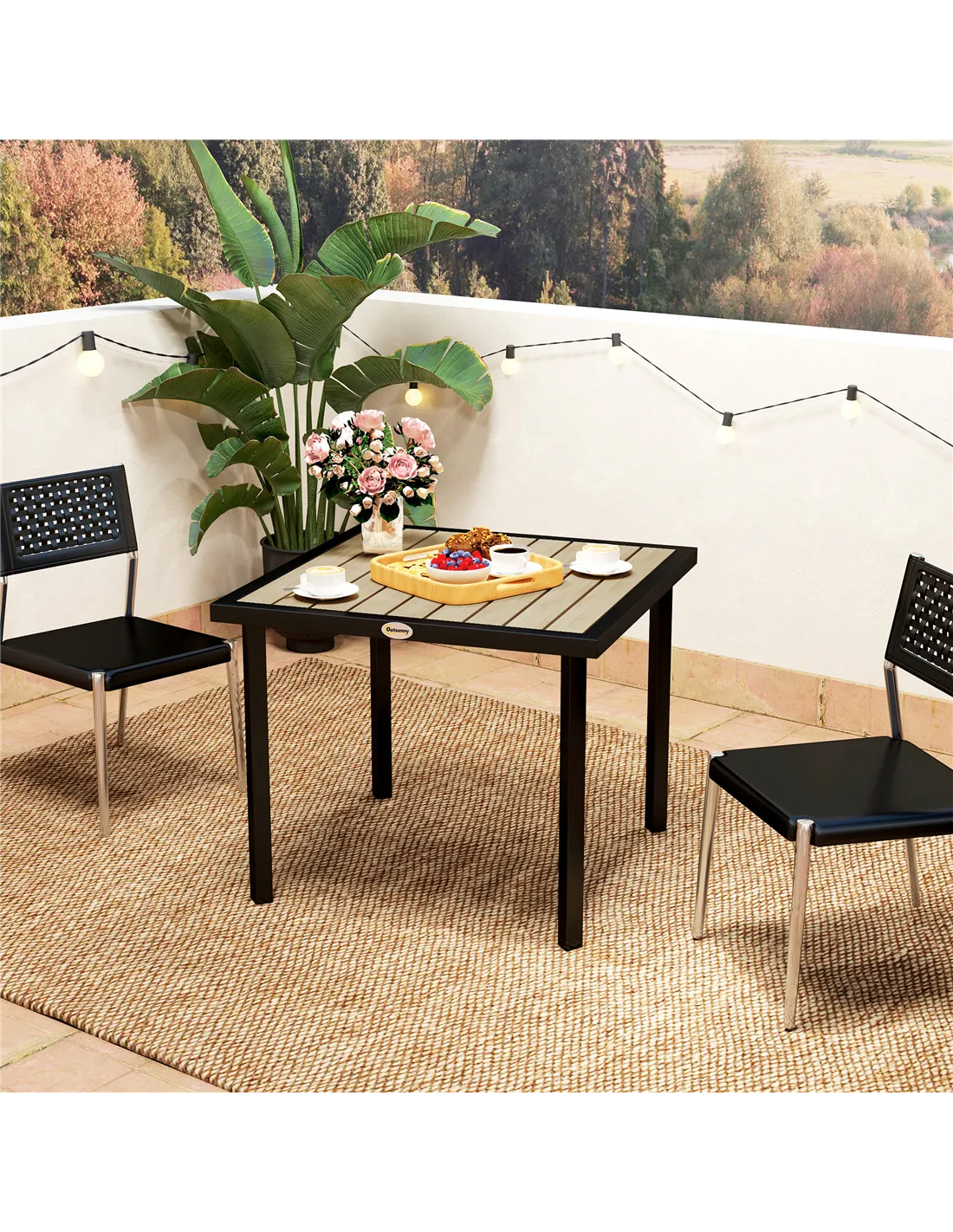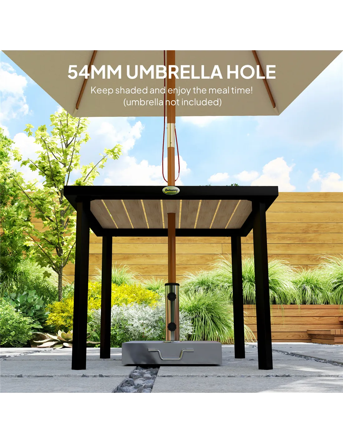 Beautiful outdoor dining starts with this Outsunny garden table, suitable for every patio or garden space. Place your parasol umbrella in the 54mm middle parasol hole and keep safely shaded in the sun. With a powder coated metal frame for a strong core, it's fitted with a robust plastic tabletop, which comes in a beautiful wood-effect design.