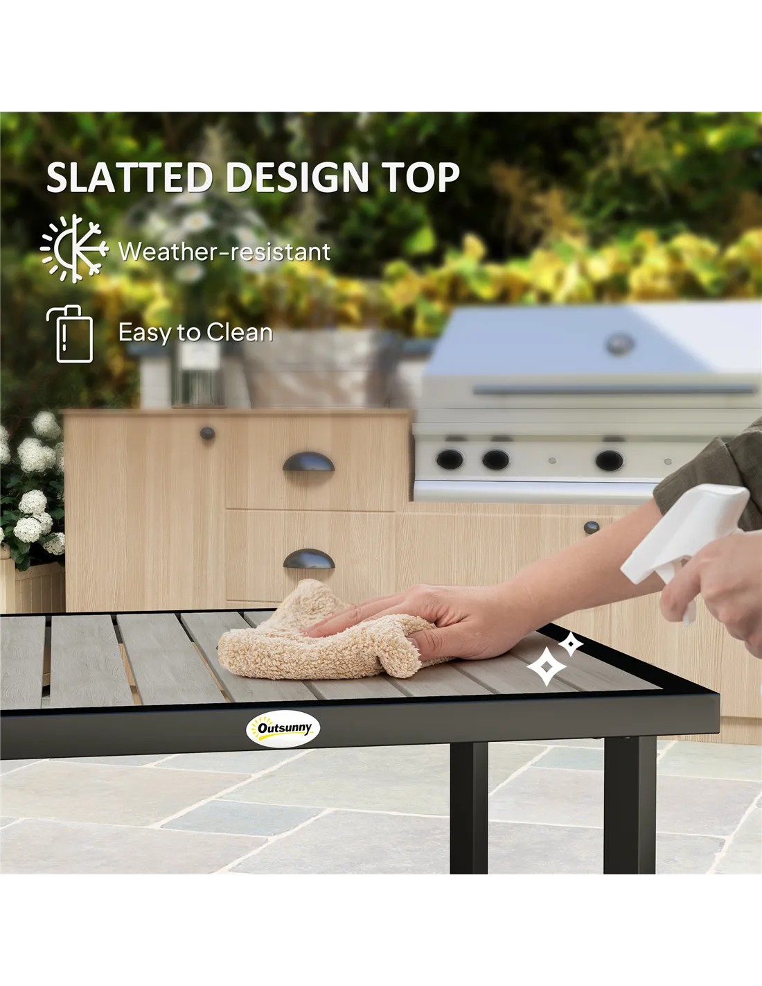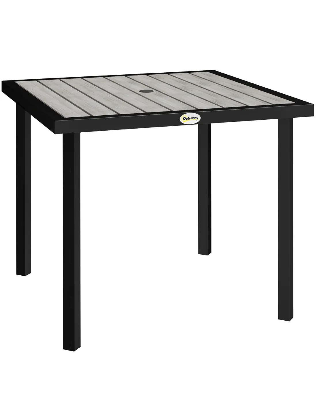 Beautiful outdoor dining starts with this Outsunny garden table, suitable for every patio or garden space. Place your parasol umbrella in the 54mm middle parasol hole and keep safely shaded in the sun. With a powder coated metal frame for a strong core, it's fitted with a robust plastic tabletop, which comes in a beautiful wood-effect design.