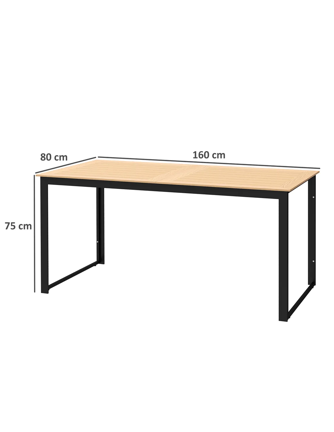 The table measures 160 cm in length, 80 cm in width, and 75 cm in height, with a maximum load capacity of 50 kg.