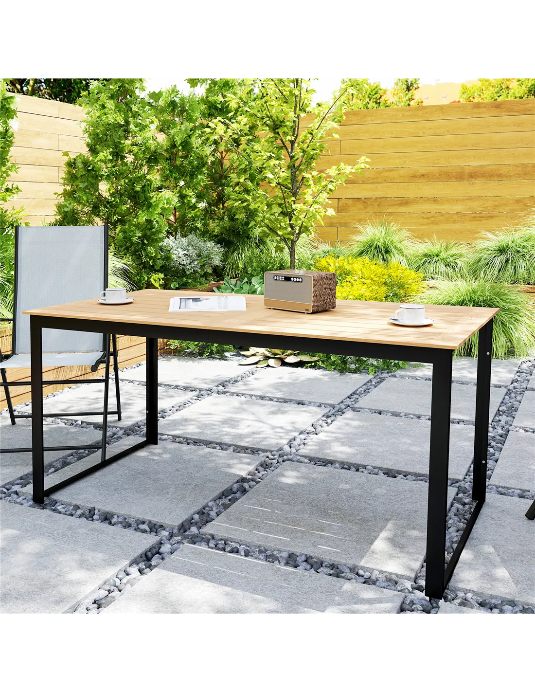 - Complements a variety of outdoor décors with its teak finish and sleek black metal frame, adding a touch of rustic elegance to your outdoor living space.