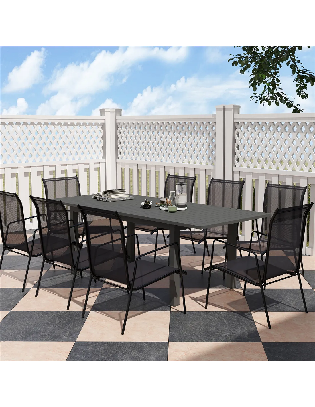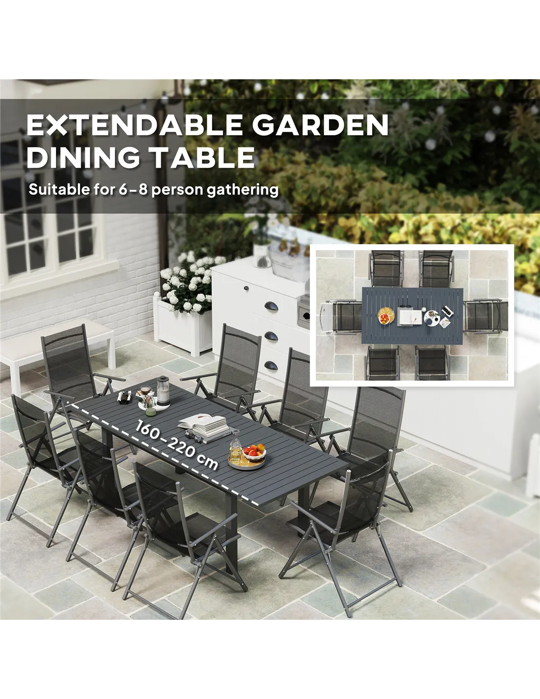 The Outsunny aluminium extending garden table is perfect for a variety of outdoor settings, from casual family barbecues to elegant garden parties. Its extendable design allows you to comfortably seat 6 to 8 guests, making it ideal for both intimate gatherings and larger social occasions. The slatted top promotes quick drying after rain, ensuring the table is ready for use without delay. Thanks to its powder-coated aluminium frame and adjustable feet, this table remains stable on uneven patios or decking, providing a reliable surface for dining or entertaining. Whether placed on a terrace, in a conservatory, or on a lawn, it complements modern outdoor décor with its sleek grey finish. Assembly is straightforward, allowing you to enjoy your new garden furniture with minimal fuss.