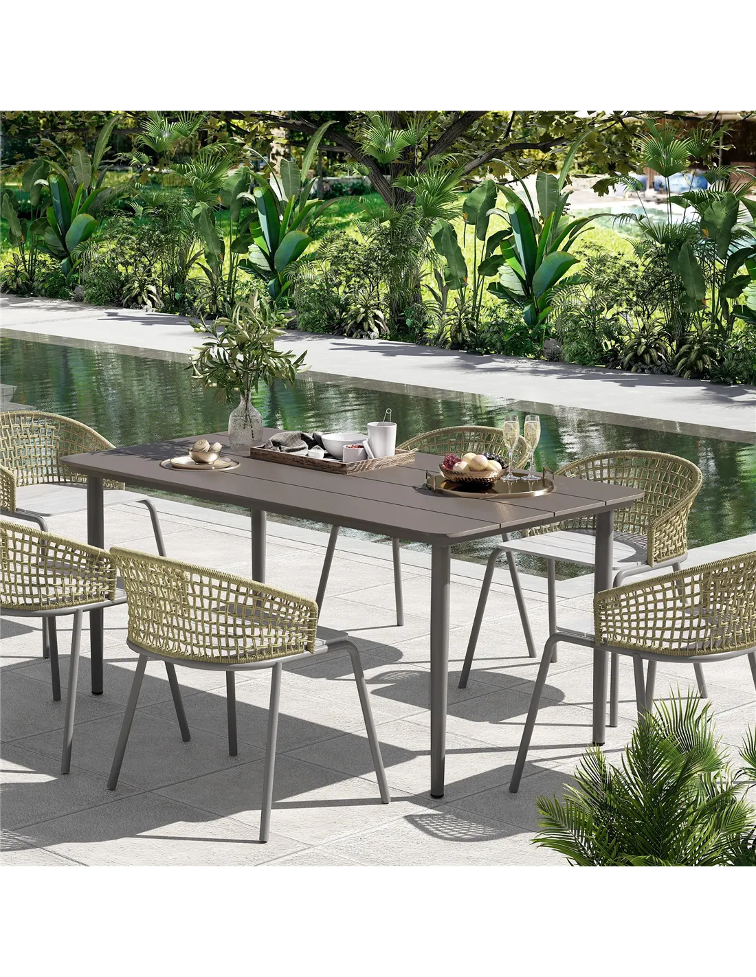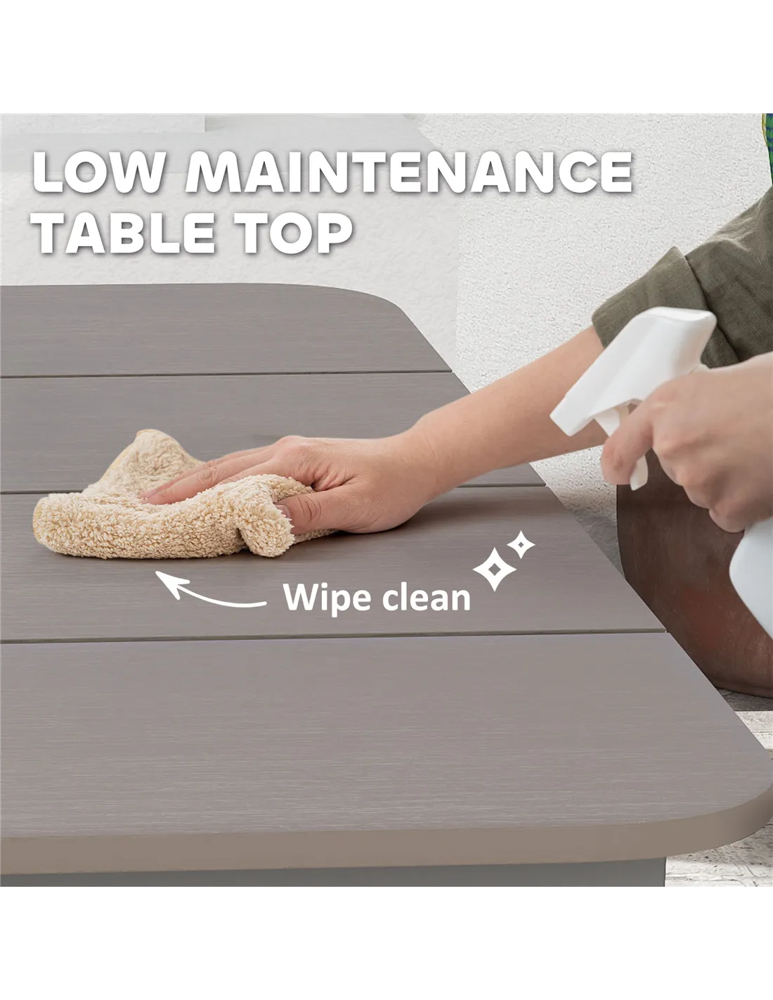 - Complements modern outdoor décor with its sleek dark grey finish and wood-effect tabletop, enhancing any exterior setting.