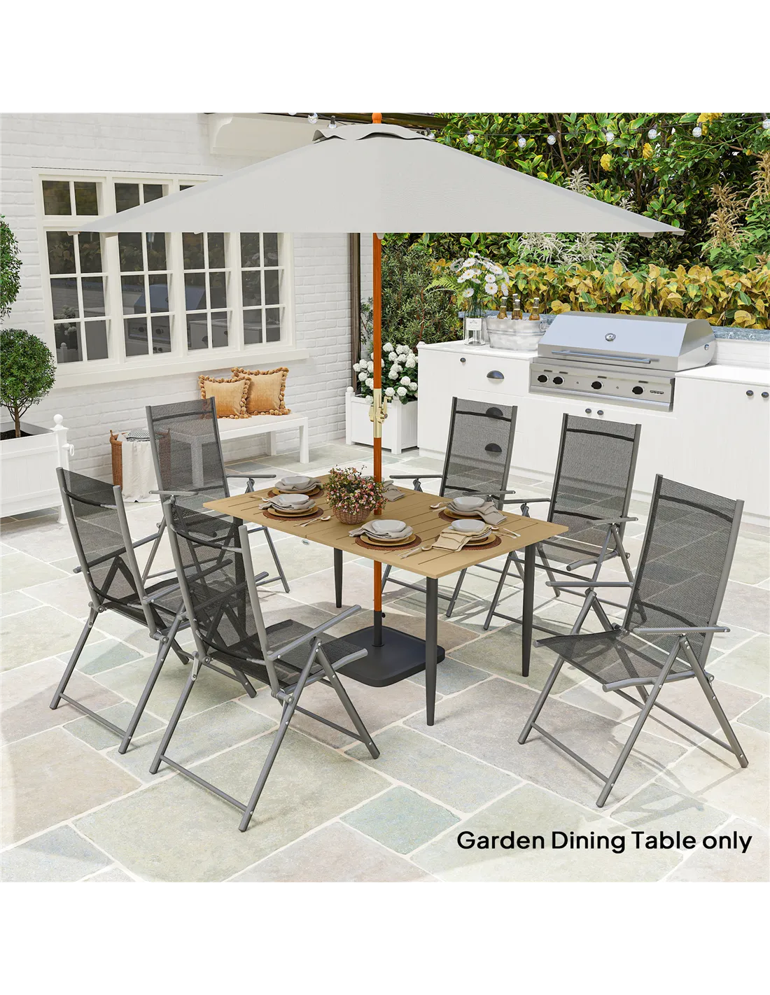 Discover the charm of the Outsunny Patio Table, your new centerpiece for every gathering. This spacious 150 x 90 cm table comfortably seats six and features a slatted design for airflow and visual appeal. It includes a practical umbrella hole for sunny days. Great for outdoor or indoor settings, from backyards to balconies, this dining table effortlessly blends functionality with style.