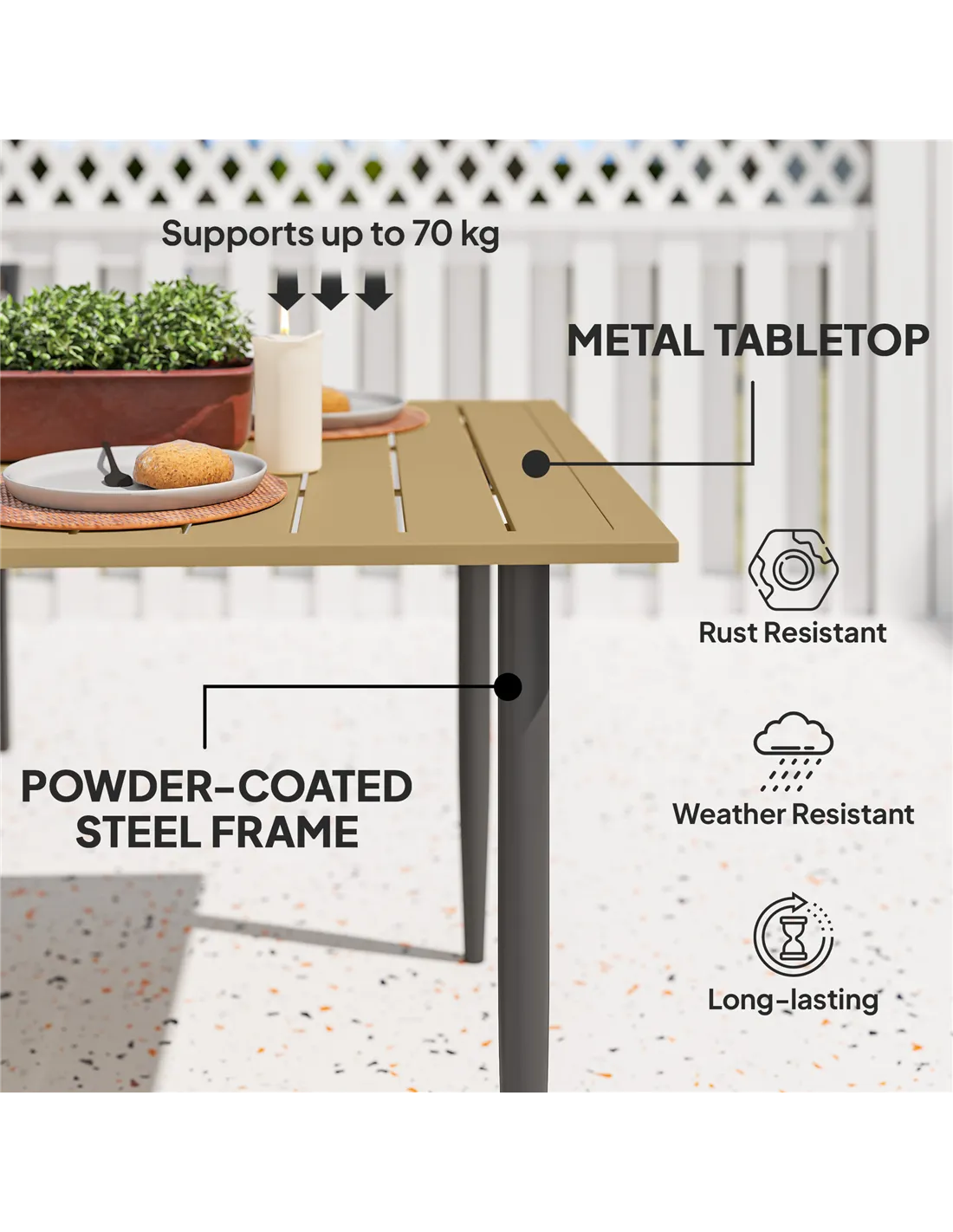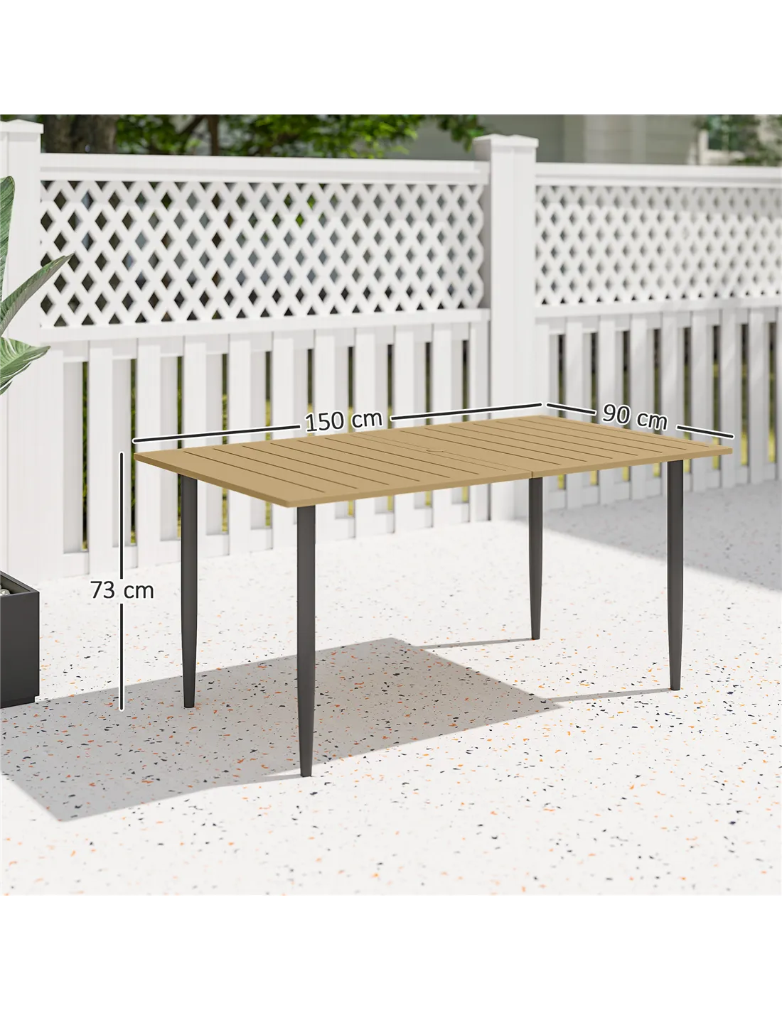 Outsunny Garden Dining Table, 150 x 90 cm Rectangle Outdoor Table with 5 cm Parasol Hole, Slatted Tabletop and Steel Frame for Patio Balcony, (Table Only) Brown
