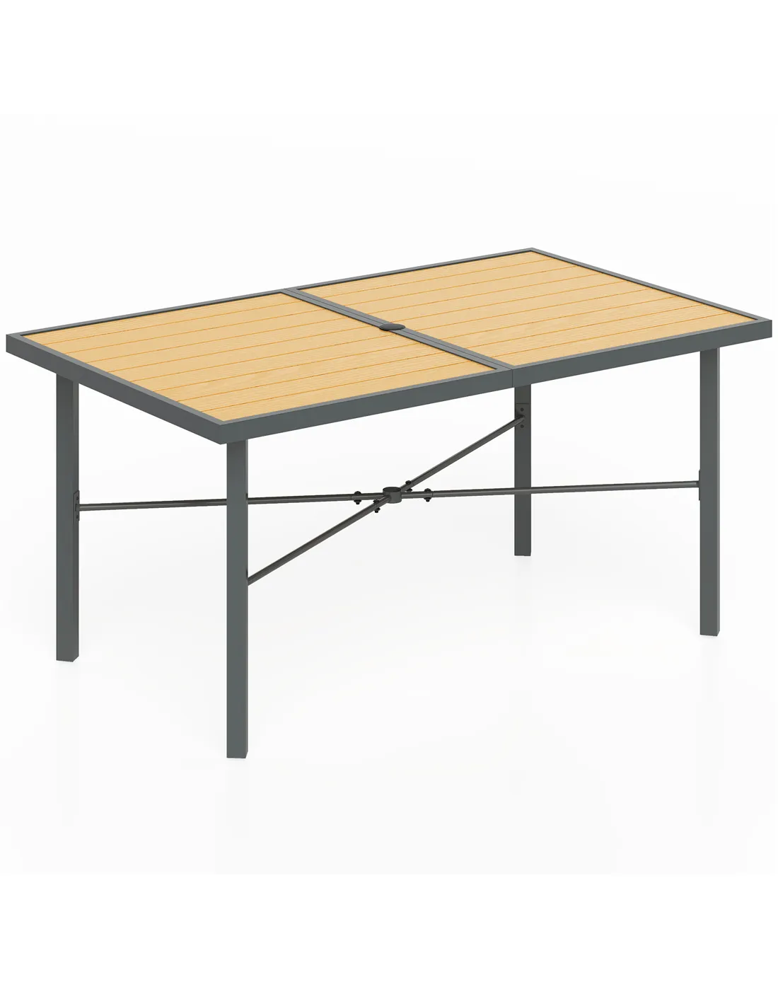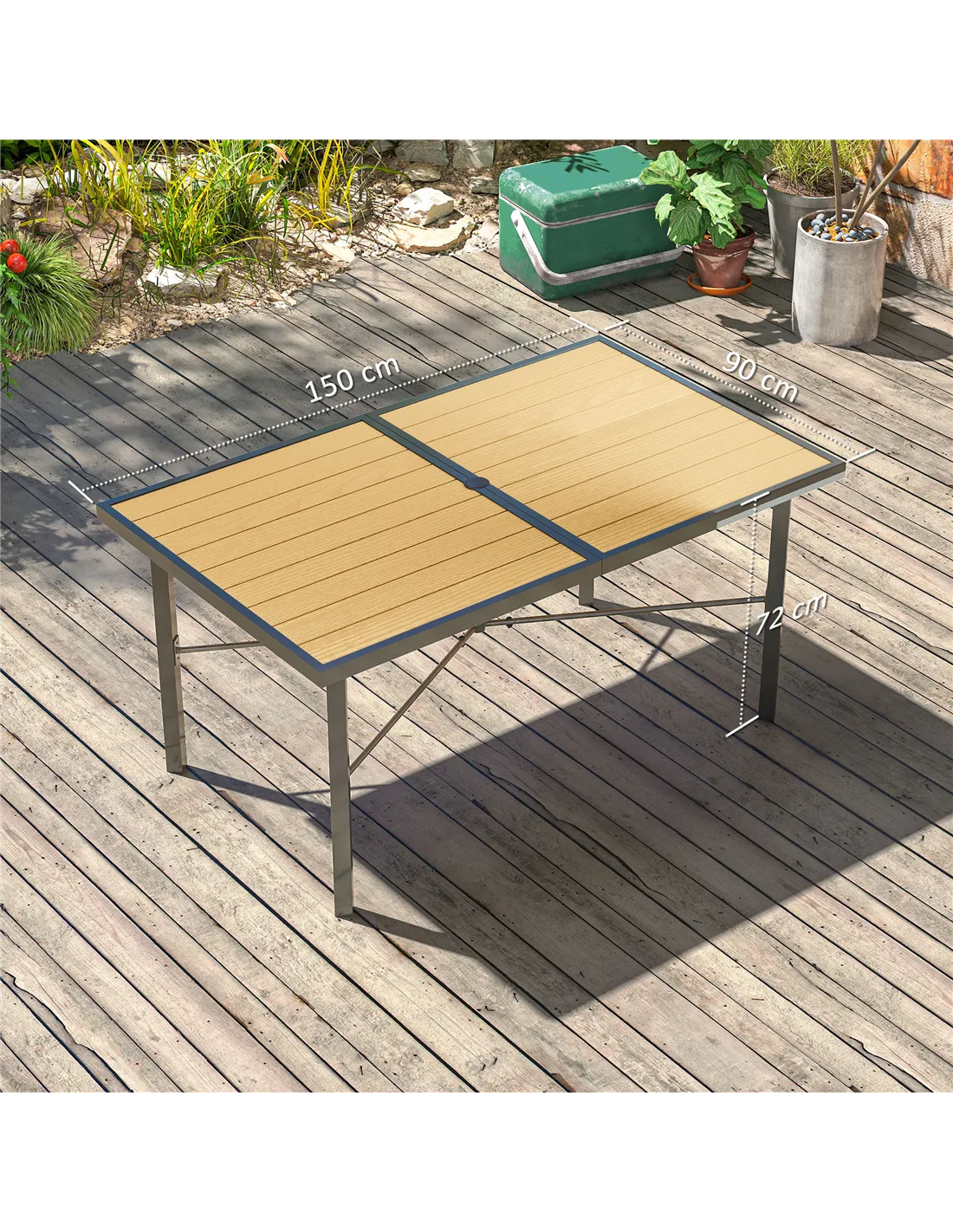 Outsunny Garden Table for 6, 150 cm Rectangular Outdoor Dining Table with 5 cm Umbrella Hole, Wood Effect Top, Rust Resistant Frame, for Patio, Balcony, Terrace, Natural Wood Finish