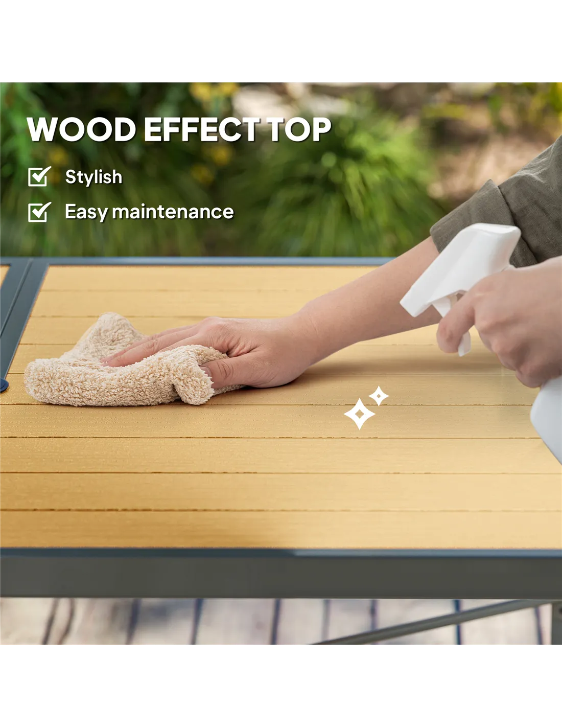 Yes, the powder-coated steel frame is rust-resistant, and the wood-effect top is designed to withstand outdoor conditions, making it ideal for UK gardens, balconies, and terraces.