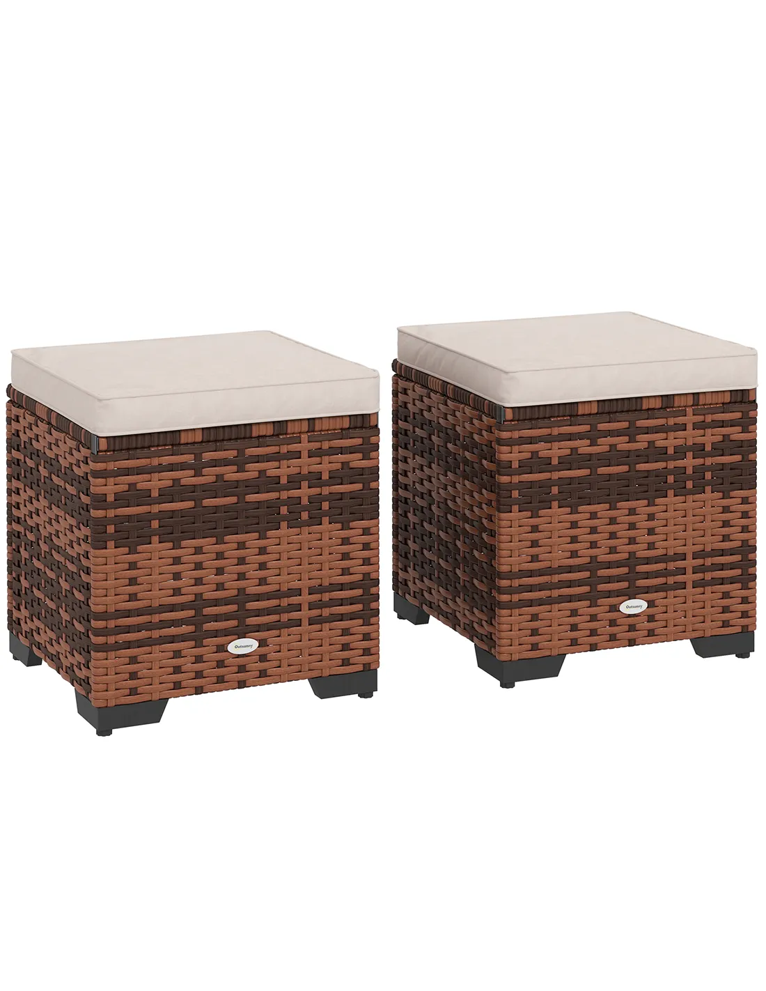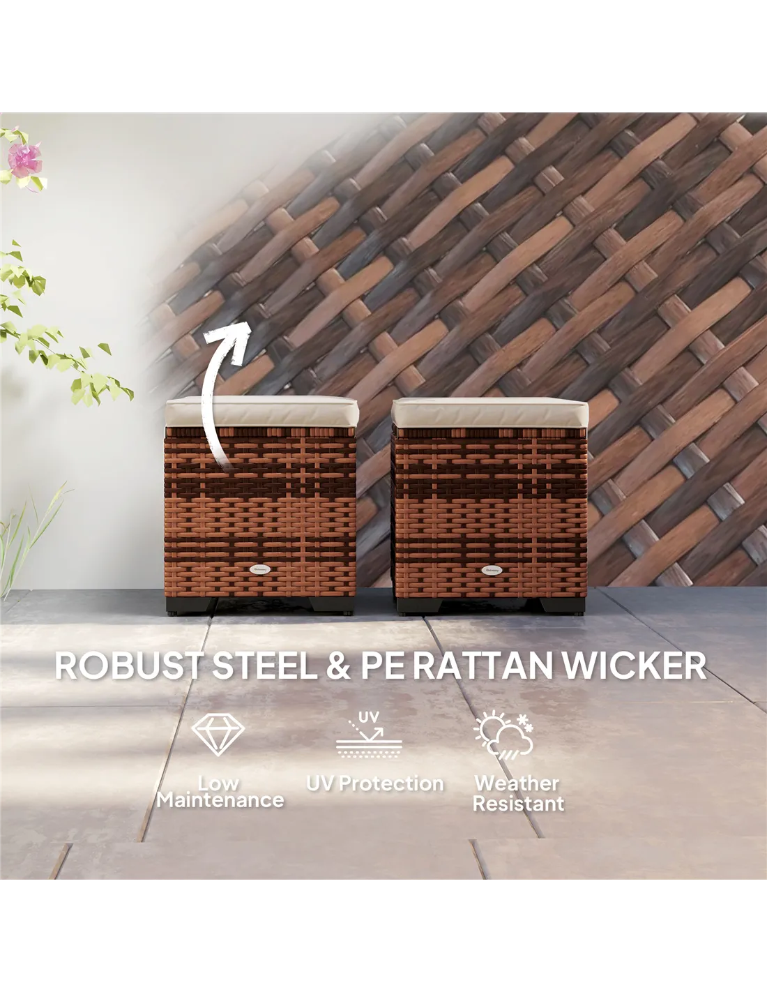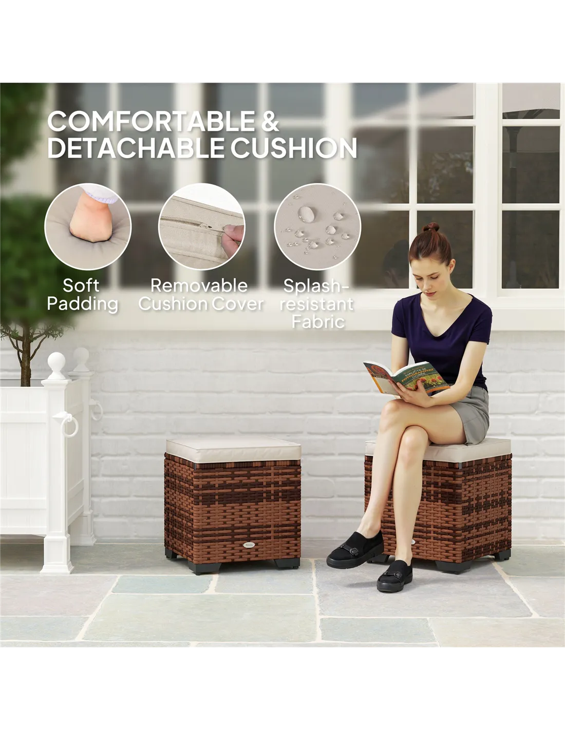 Outsunny Set of 2 Rattan Storage Ottoman, Outdoor Footstool with Removable Cushions, Garden Storage Seat for Balcony, Porch, Living Room, Beige
