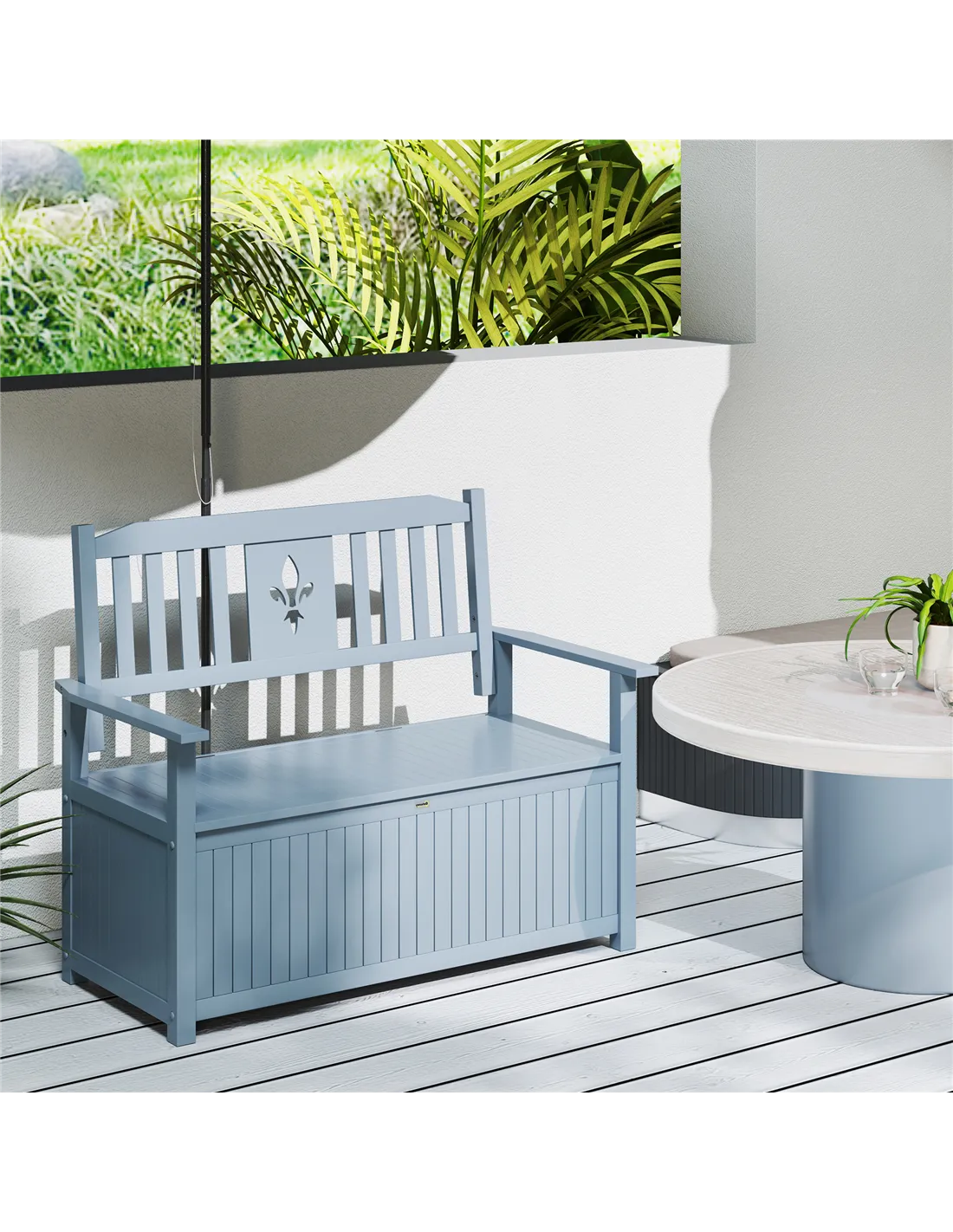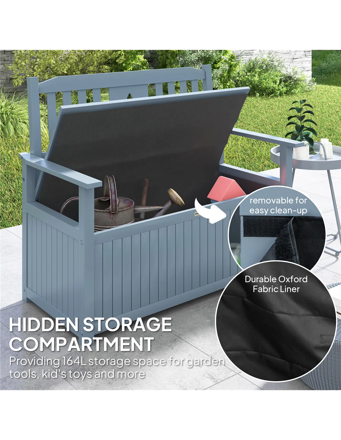 - Perfect for patios or verandas, it provides both seating and discreet storage for cushions, gardening tools, or picnic accessories.