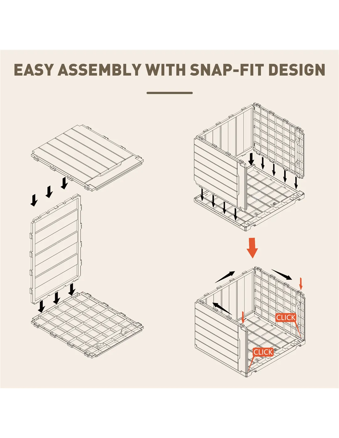 - Snap-fit design allows quick, hassle-free assembly