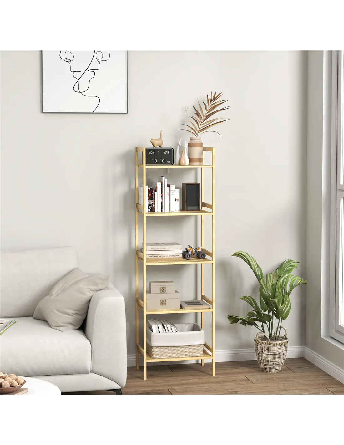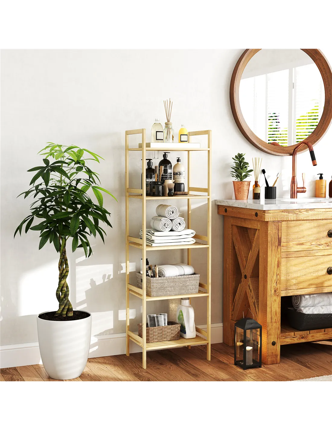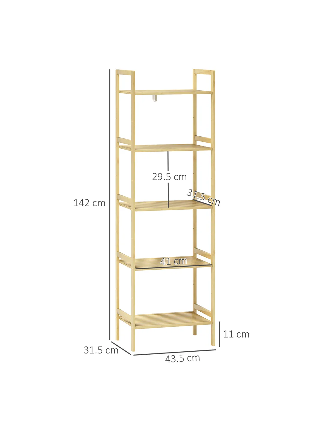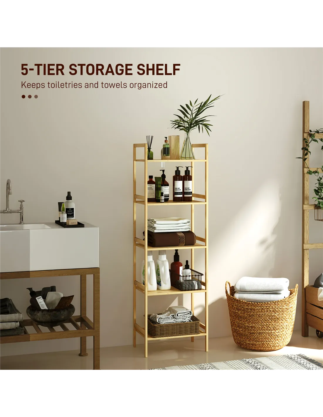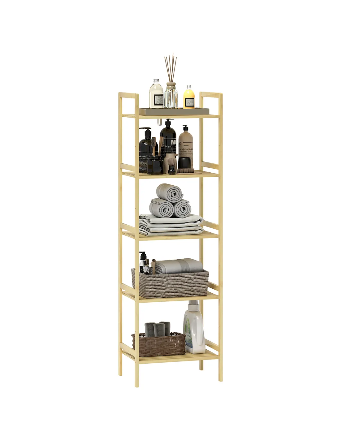 This HOMCOM bathroom shelf unit is a simple and spacious piece, for keeping all essentials in one spot. Made from bamboo, it is naturally strong and moisture resistant. Comes with five shelves so there's plenty of storage; with nine available levels to set each shelf to a position of your choice.