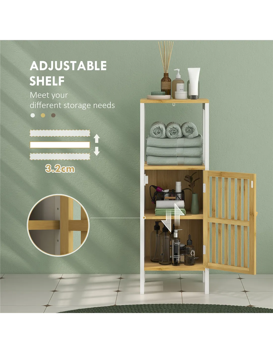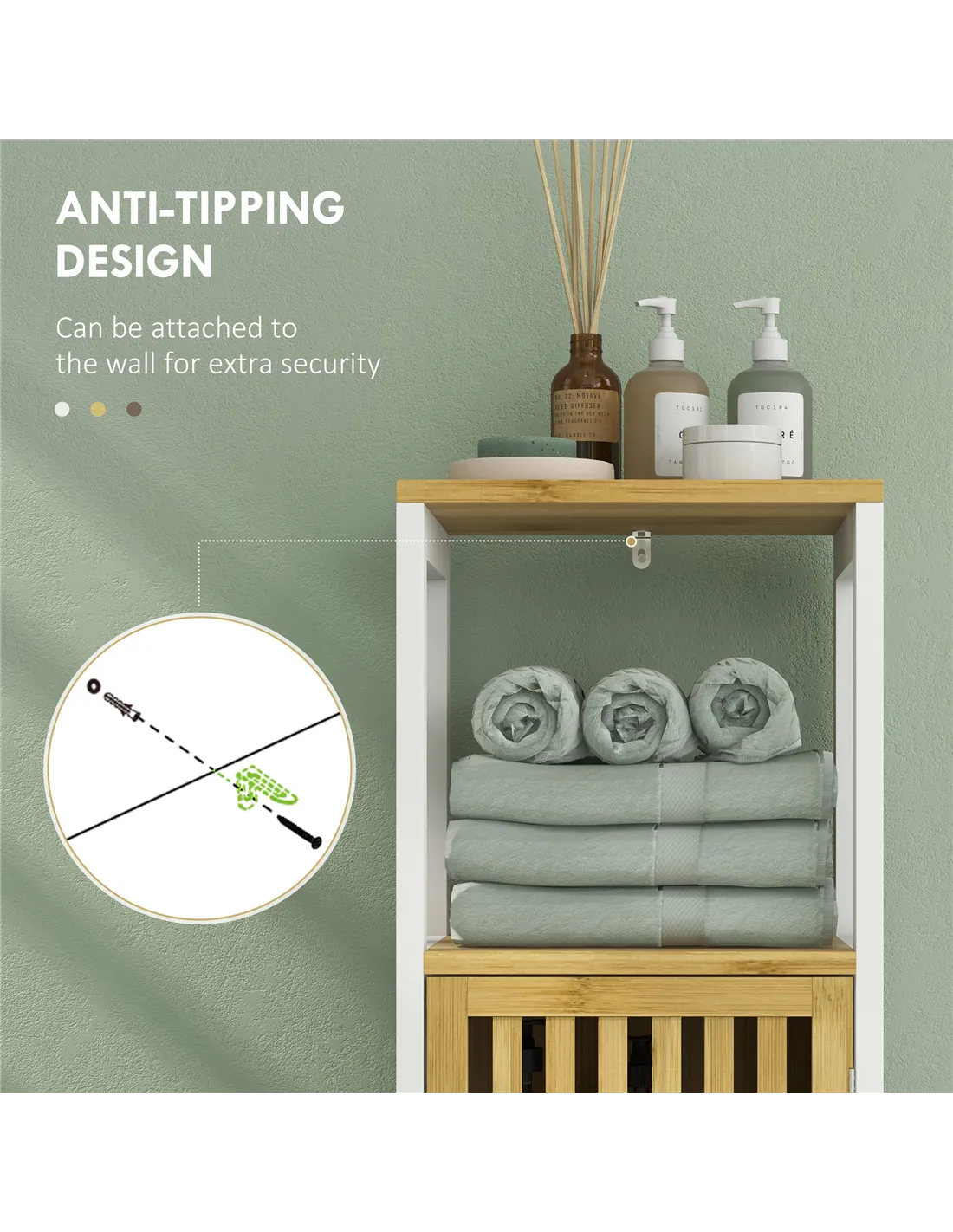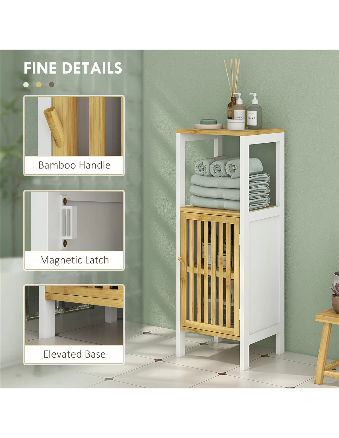 Retro charm for your bathroom, merged with adjustable storage. This HOMCOM slim storage cabinet combines a bottom cupboard and two upper shelves. Inside the cupboard there is a three-position adjustable shelf, so you can set it to the position you want. Made from a bamboo blend, this bathroom storage unit is a reliable piece, suitable for everyday use.