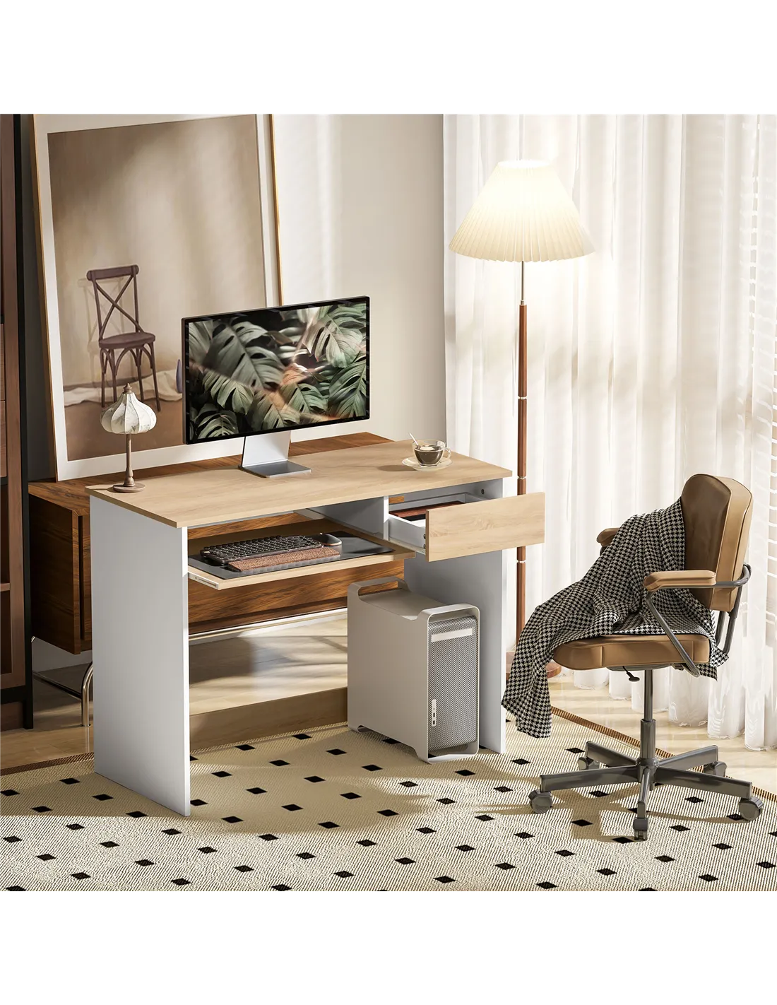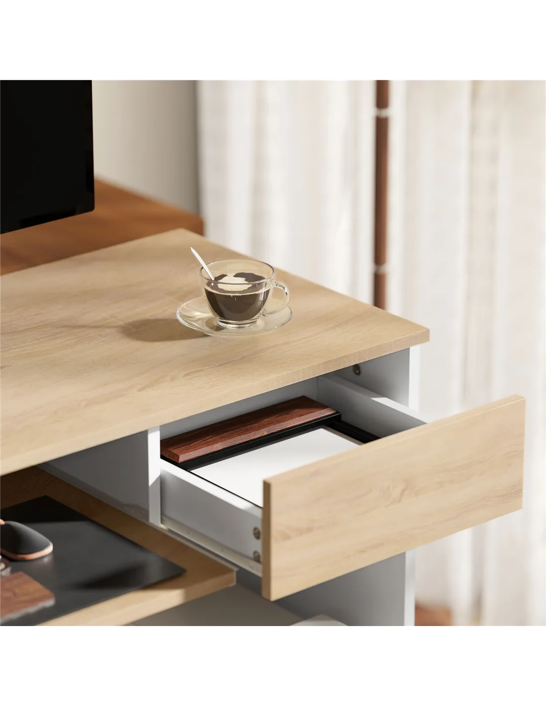 - Use it as a stylish study desk in a bedroom or student flat, where the keyboard tray and drawer help keep stationery and devices organised.