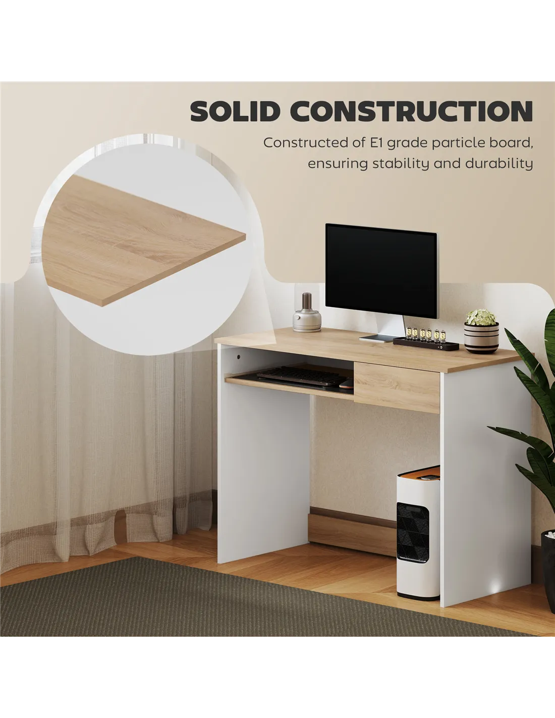 Efficiently save space with this computer desk from HOMCOM. Featuring a keyboard tray and a drawer, it saves a lot of desktop space. Constructed of particle board with oak surface, it's easy to maintain and brings you the atmosphere of nature. Its contemporary look will blend beautifully into any style decor. It's a great choice for you to have this desk in your study, office, or bedroom to enrich your furniture while saving space!