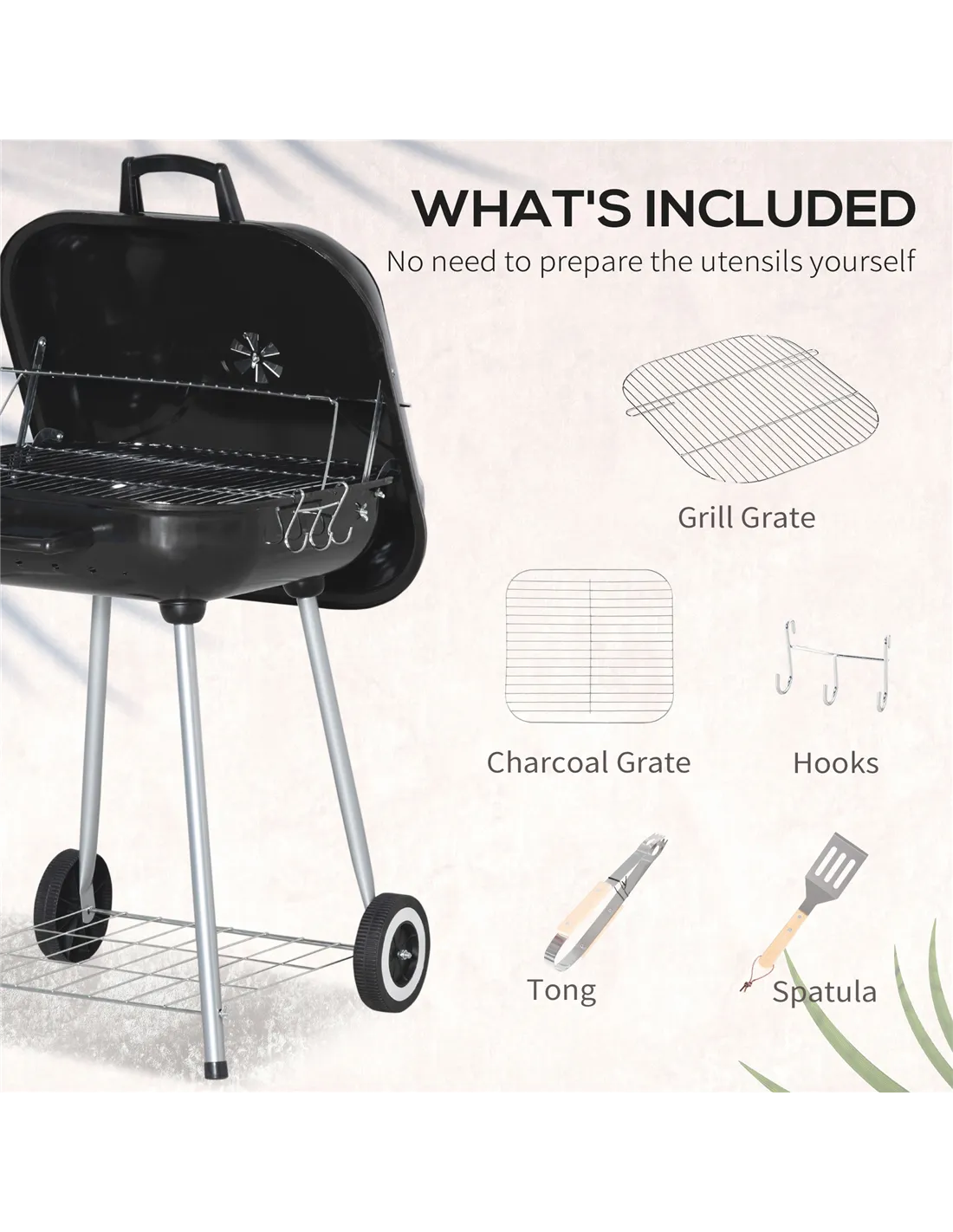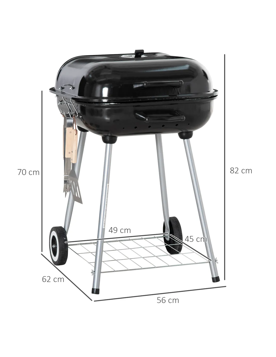 - Bottom shelf for storage of charcoal, plates, or anything else