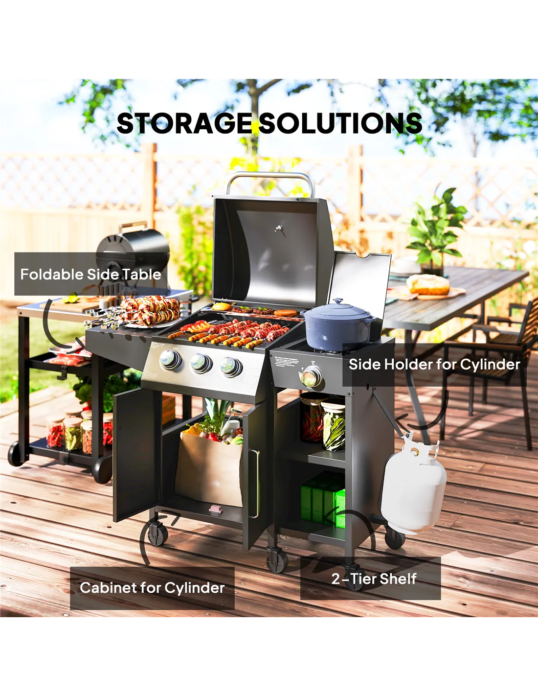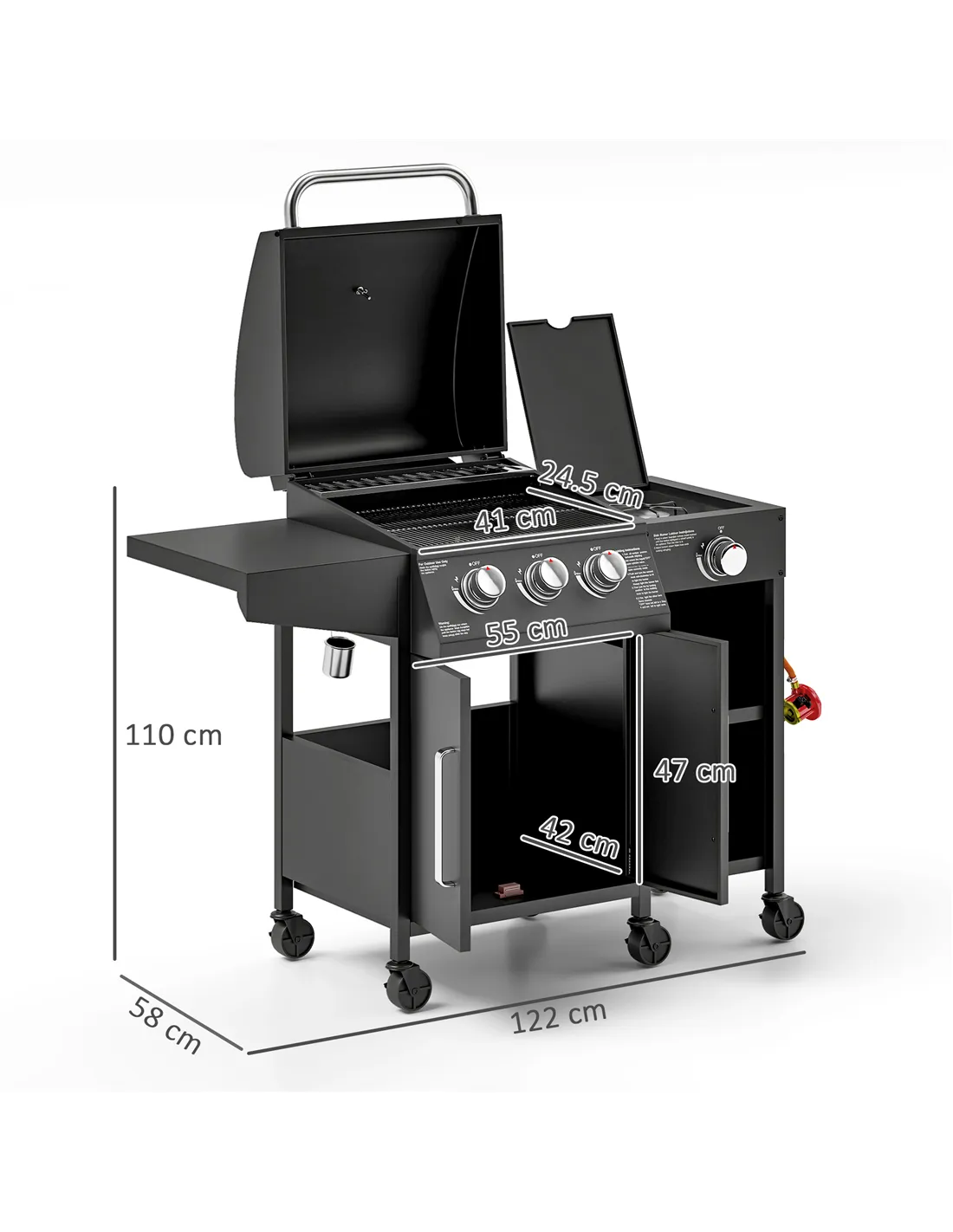 The Outsunny 3+1 burner gas BBQ trolley is perfect for a variety of outdoor occasions, from casual family gatherings to lively garden parties. Its spacious grilling surface and warming rack allow you to prepare multiple dishes simultaneously, while the side burner is ideal for simmering sauces or cooking side dishes. Thanks to its six castor wheels, including four with brakes, you can easily position the grill on your patio or lawn, adapting to your outdoor space. The integrated storage cabinet and shelves provide convenient space for utensils, condiments, and a 20 lbs gas cylinder, keeping everything organised and within reach. Whether you’re hosting a summer barbecue or enjoying a weekend cookout, this robust and versatile gas grill enhances your outdoor cooking experience with ease and style.