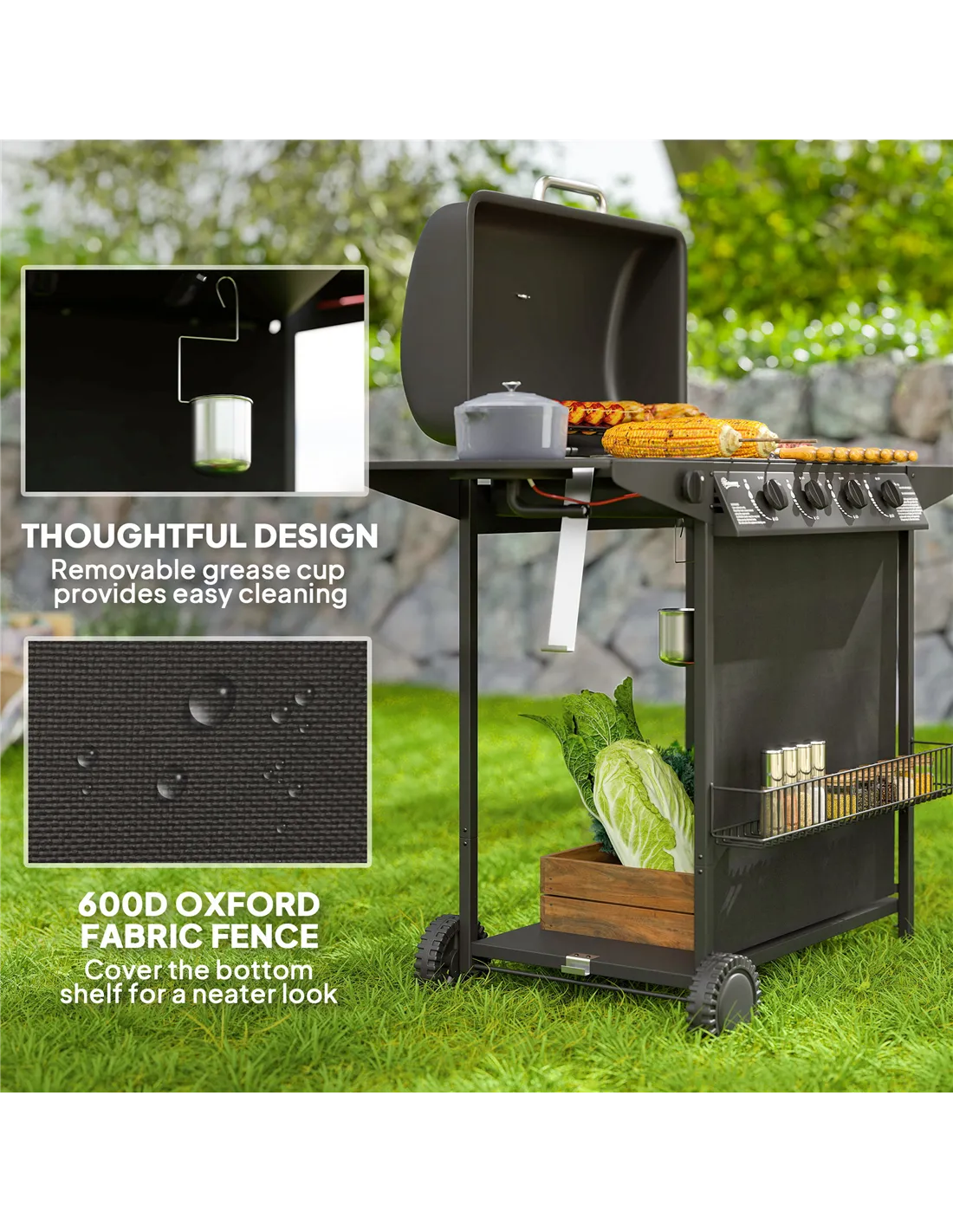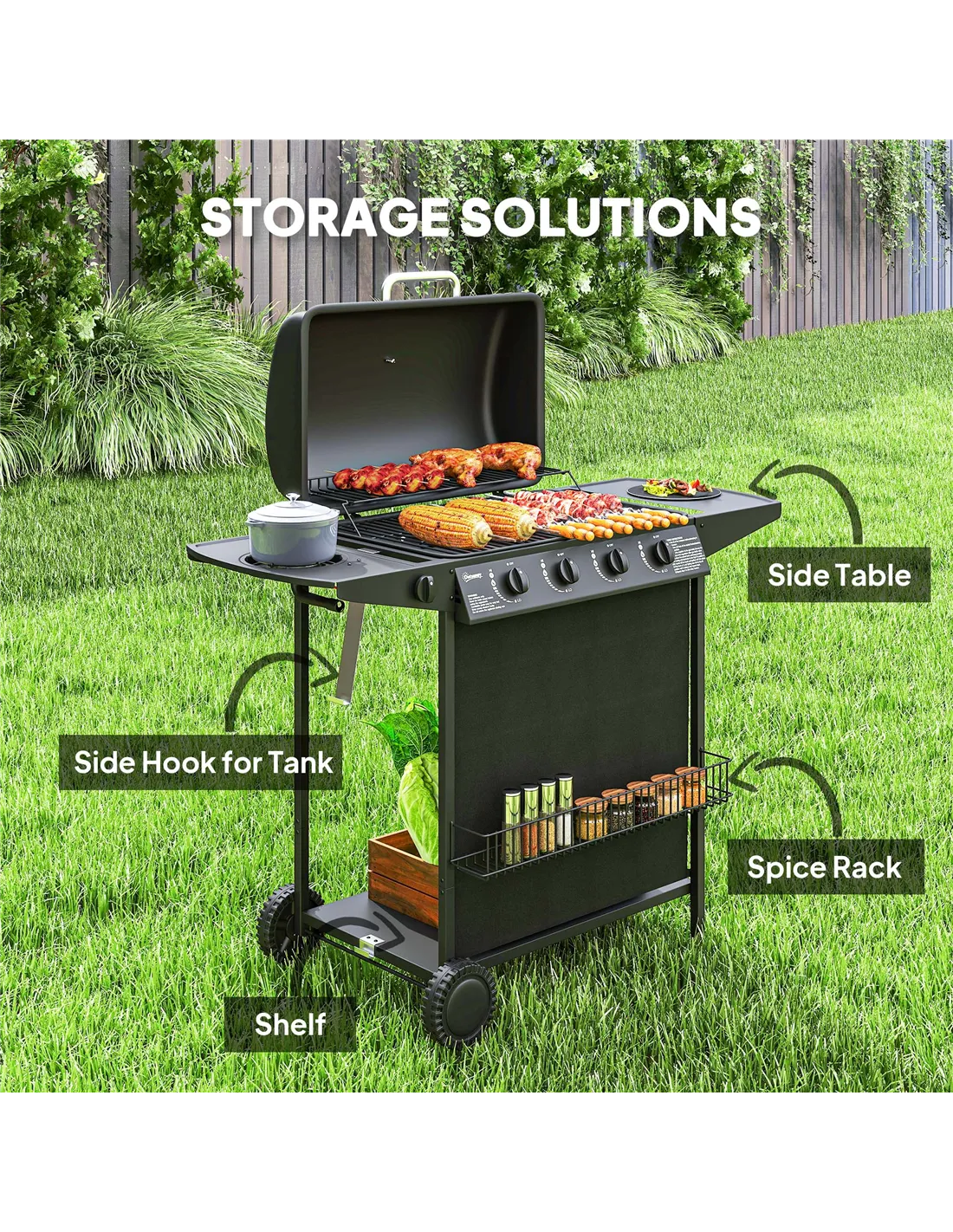The Outsunny 4+1 burner gas BBQ grill is perfect for a variety of outdoor cooking occasions across the UK. Whether hosting a lively garden party, enjoying a weekend family barbecue, or preparing a casual meal on your patio, this versatile grill adapts effortlessly. Its spacious cooking surface and warming rack allow you to prepare multiple dishes simultaneously, while the side burner is ideal for simmering sauces or side dishes. Thanks to its portability and wheels, you can easily move it around your garden or outdoor space to suit your setup. The integrated spice rack and side table provide convenient storage, keeping your essentials close at hand for a seamless cooking experience.