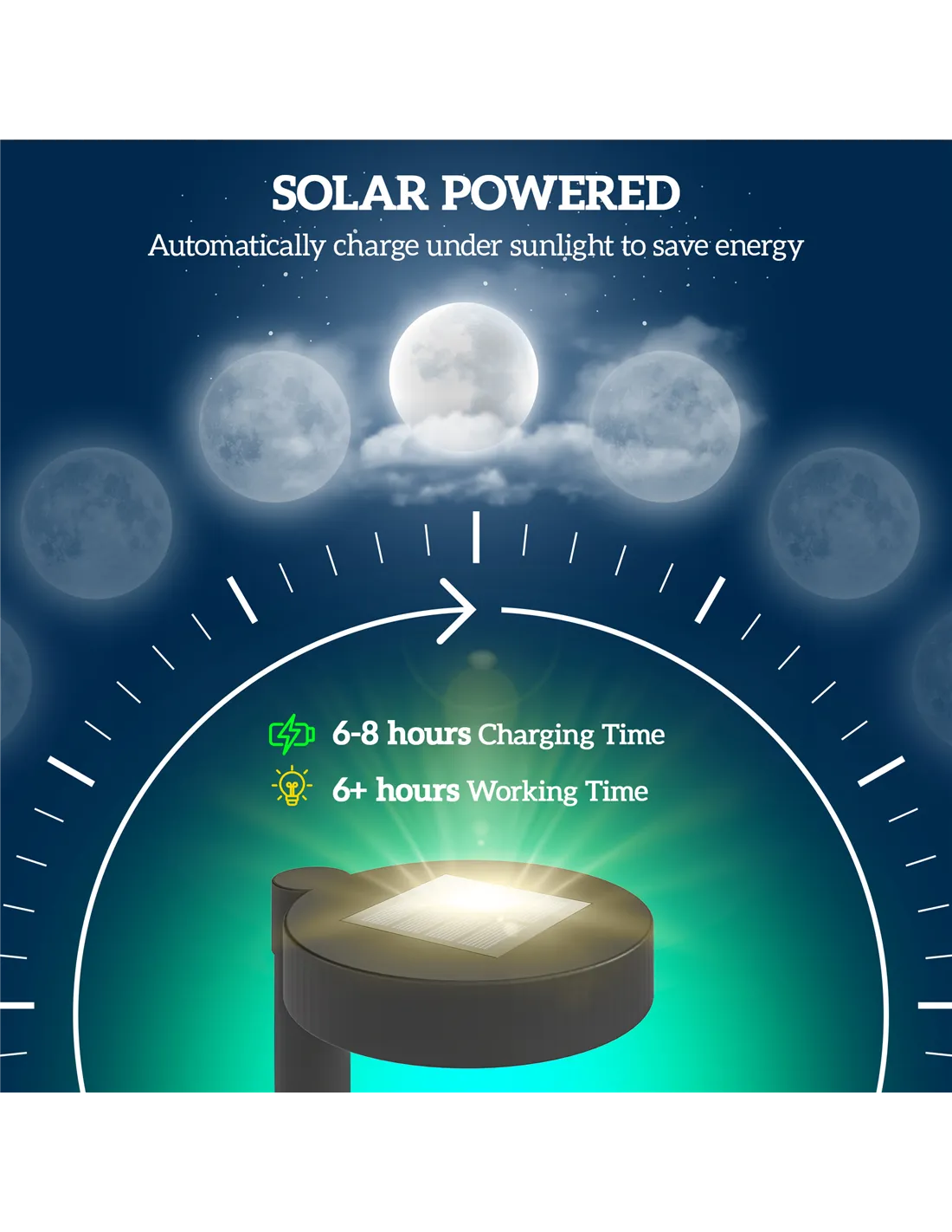 - Solar panel charges six to eight hours of full sunlight for more than six hours of light