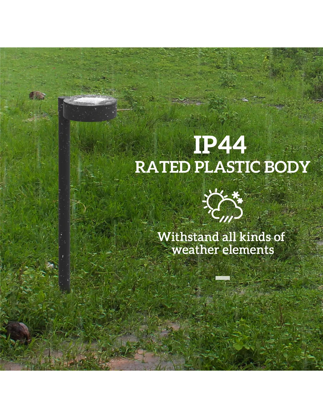 - Plastic structure with IP44 rating for outdoor use