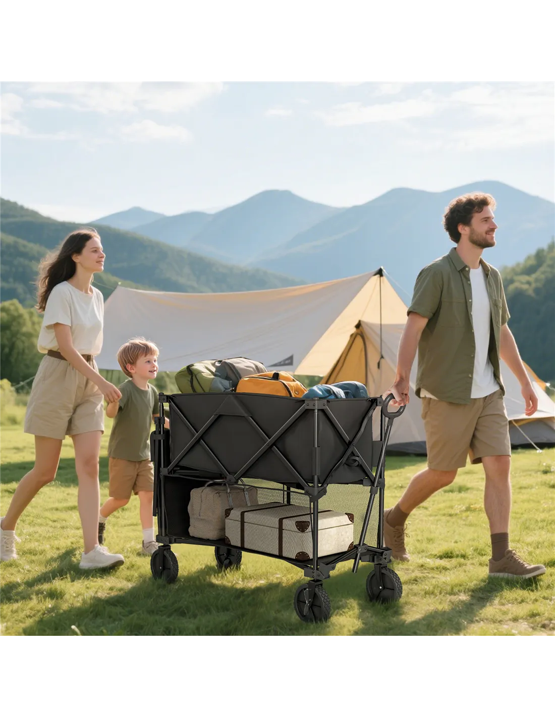 The sturdy steel frame supports up to 200 kg evenly distributed, suitable for heavy loads during camping, shopping, or gardening. - Can the trolley be used on rough terrain?