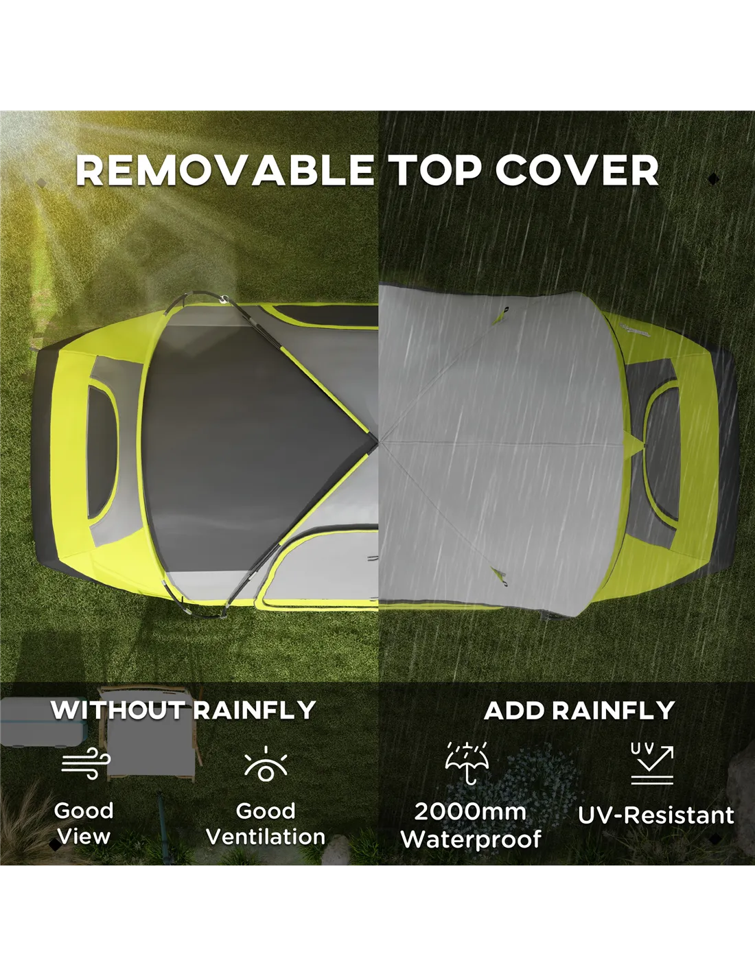 - Small removable top rainfly: 2000mm rain protection