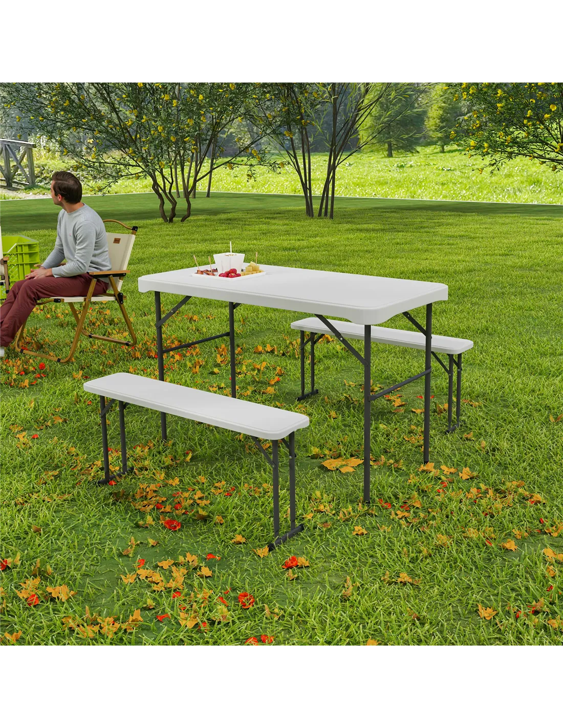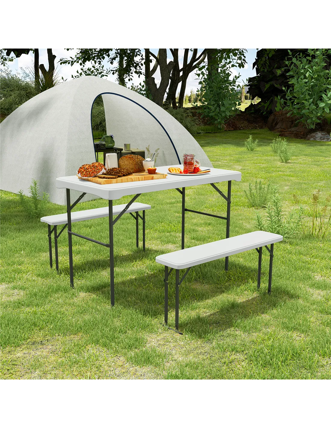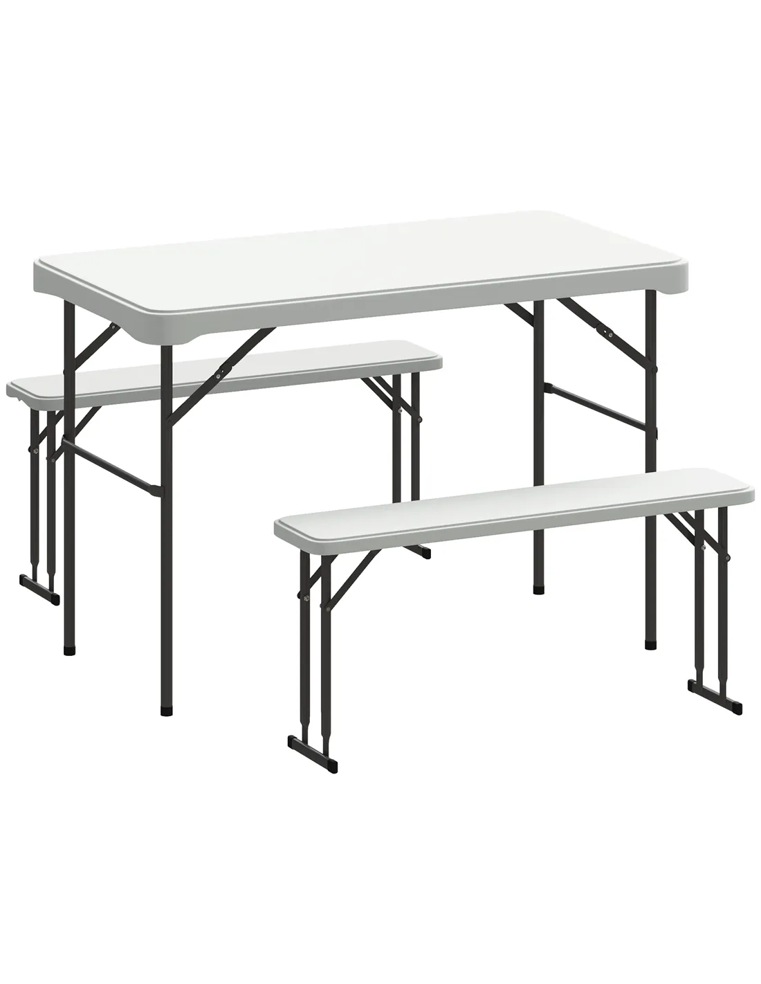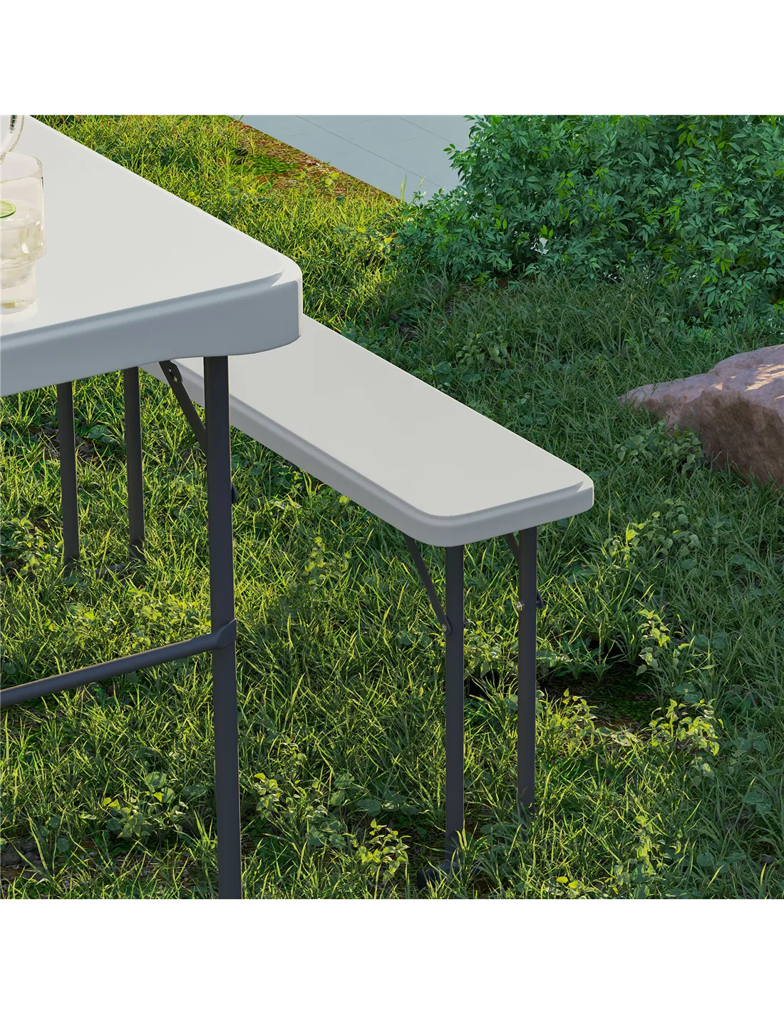 This Outsunny three-piece set comes with a foldable table and two benches - this is the set for you to bring to camping trips, picnics or festival outings. Each piece has a metal frame for a strong and supportive core, fitted with tough HDPE plastic tabletops. Simply fold up and fold out - with a handle to carry around easily.