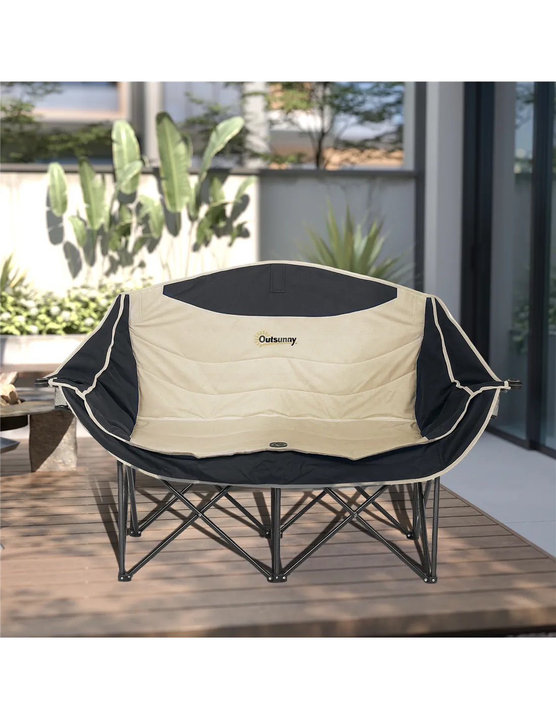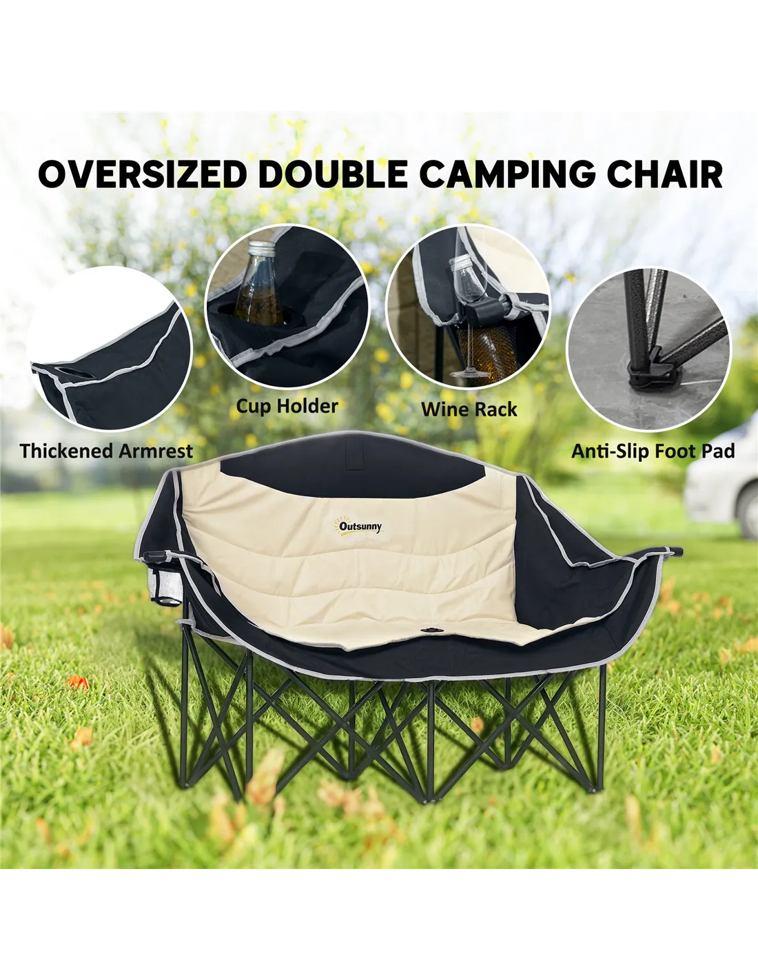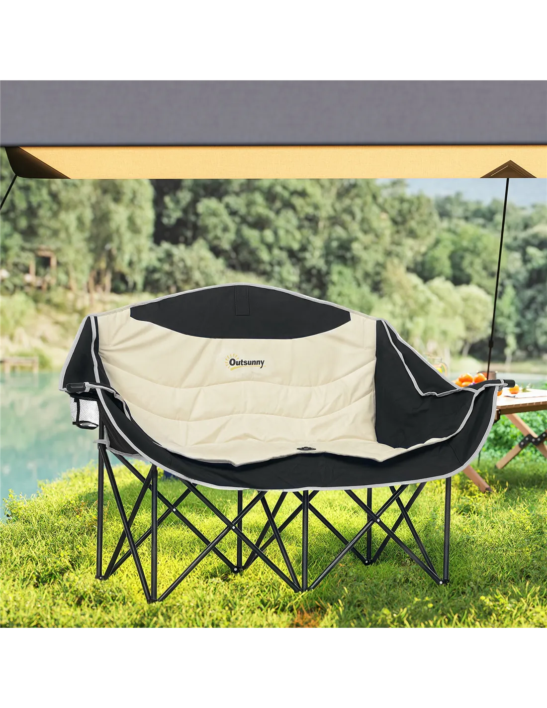 Discover the comfort of the great outdoors with the Outsunny Double Camping Chair! Featuring two padded seats with armrests, wine glass holders and cup holders, this portable chair offers extra space and relaxation. Crafted from robust 600D Oxford fabric and a solid metal frame, it's a great companion for any adventure, whether at the beach, garden, or campsite.