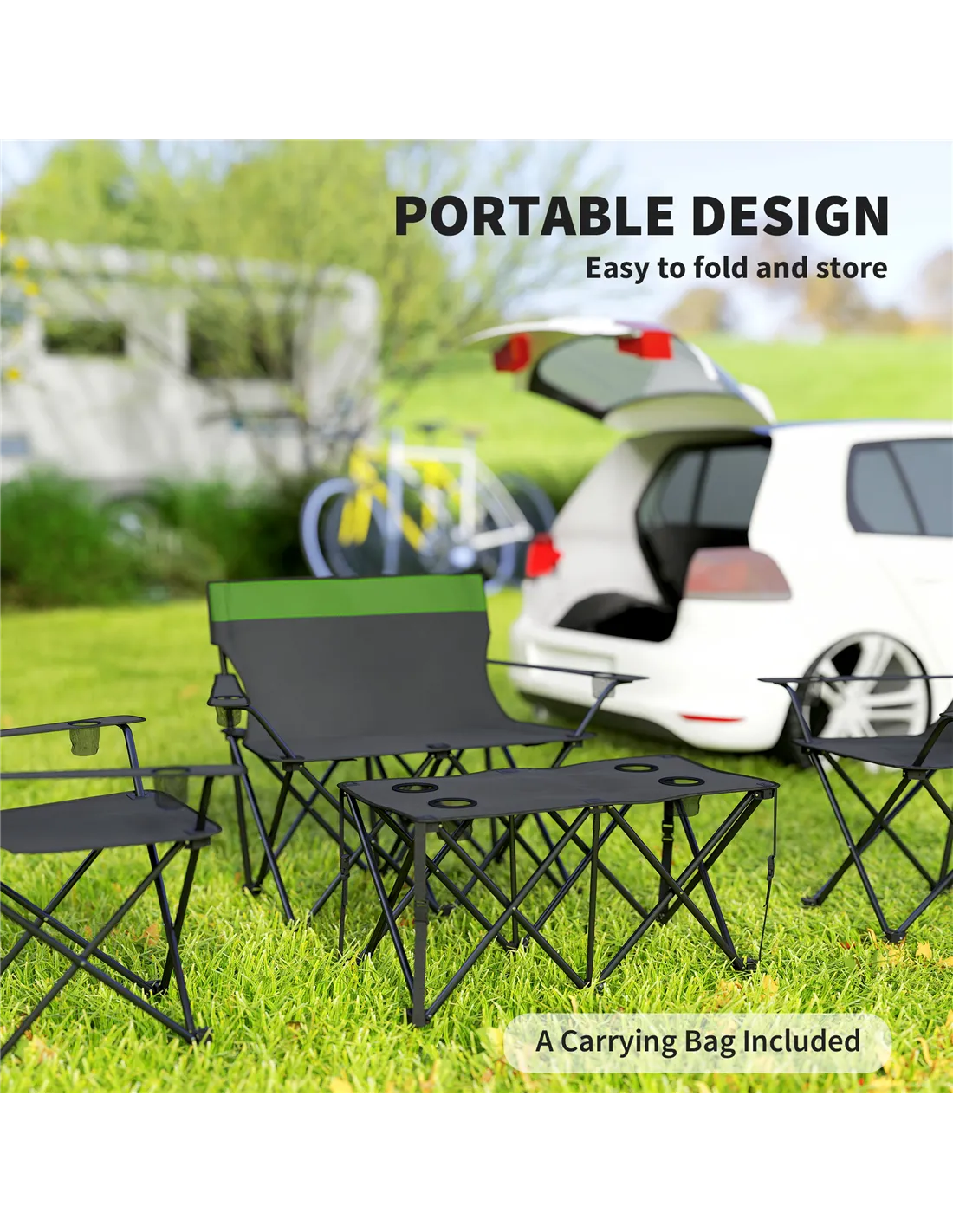 Bringing everyone together during outdoor trips is easy, with this Outsunny camping table and chairs set. It comes with two single chairs, a double chair and a foldable table. There are mesh cup holders in all arms and the table, offering a handy, close-by place for drinks and more.